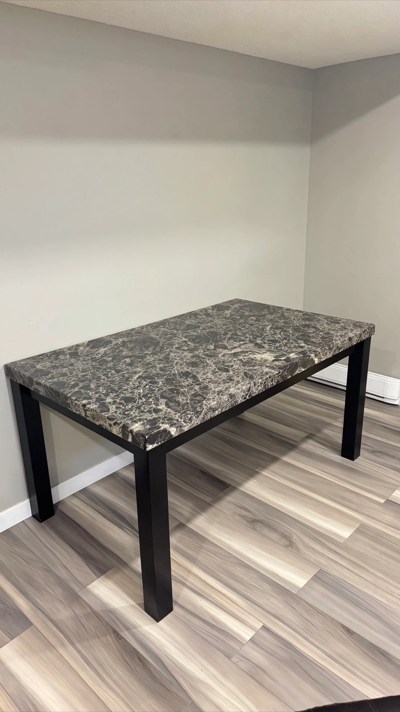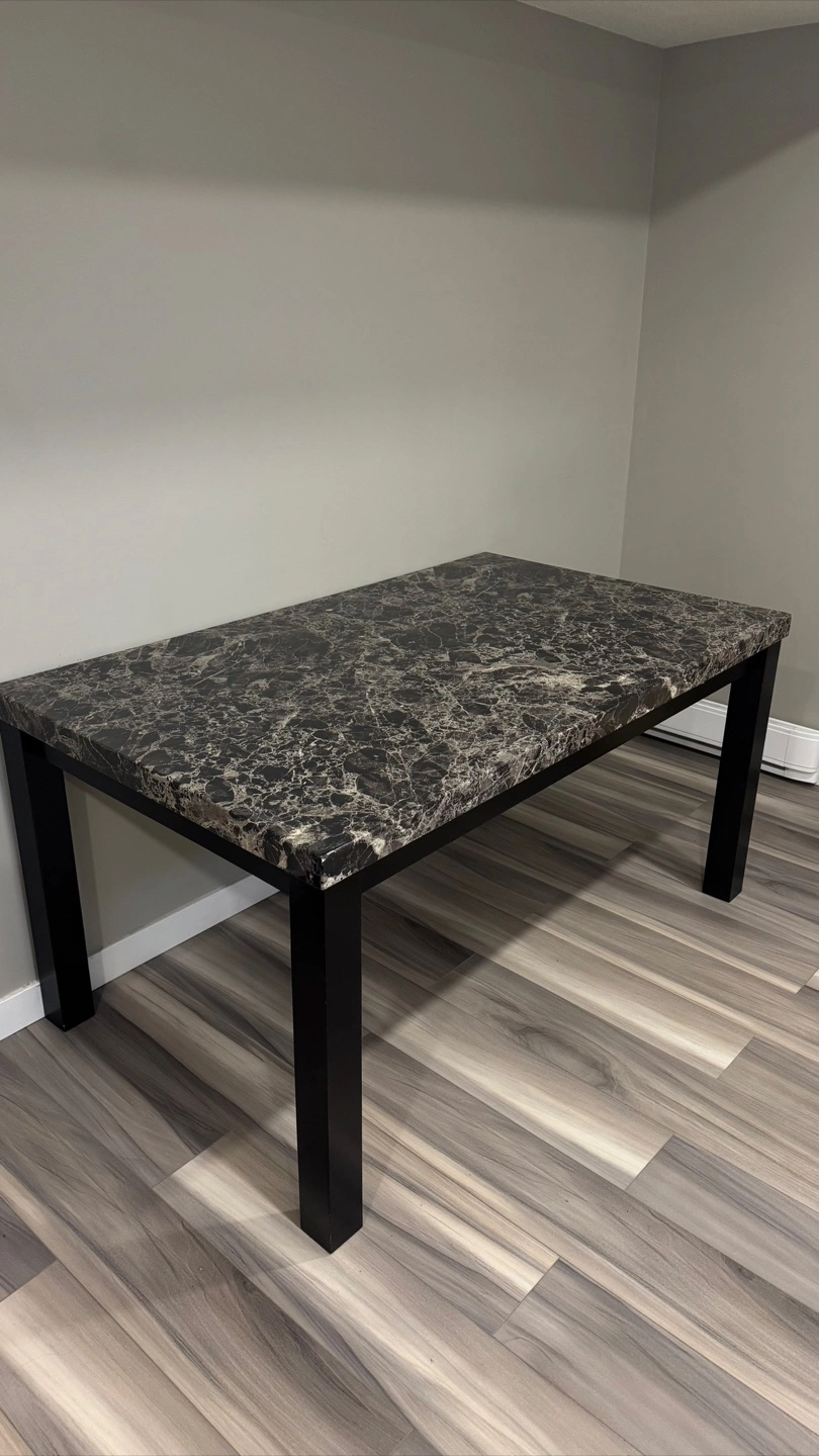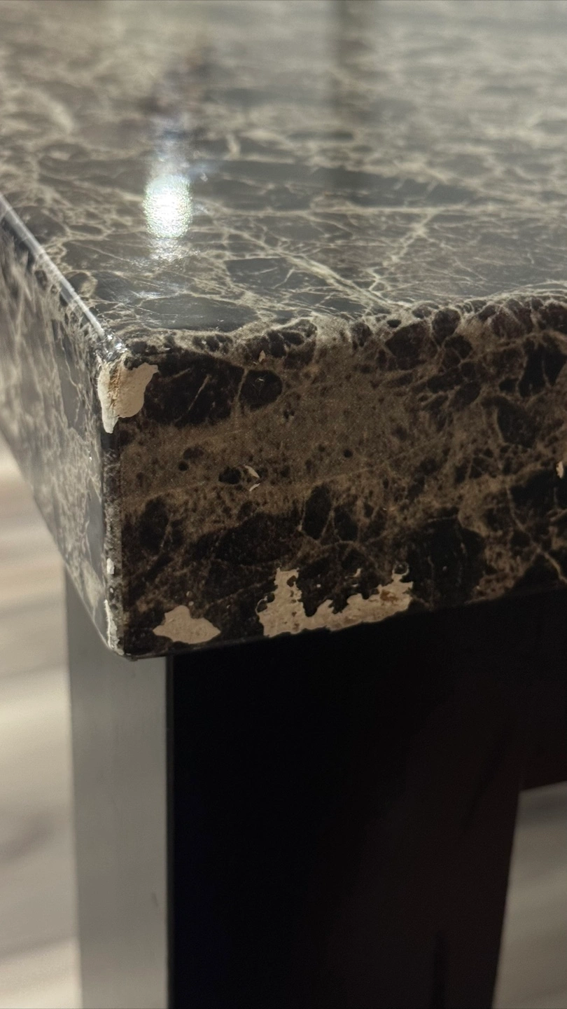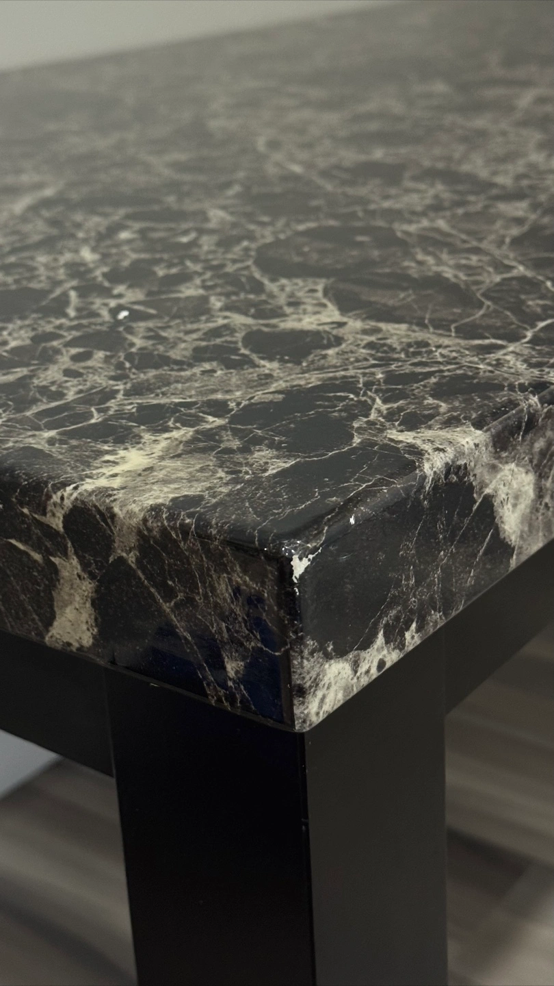 Selling a dining table with a faux marble top and black legs. There is some wear and tear on the corner of the table, as shown in the pictures. Still a very stylish piece! All chair just for gift!๐