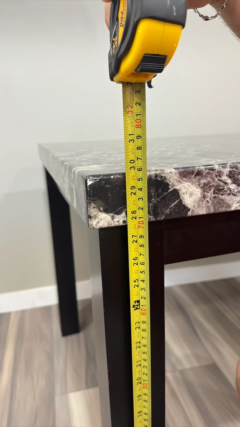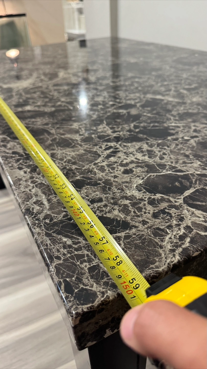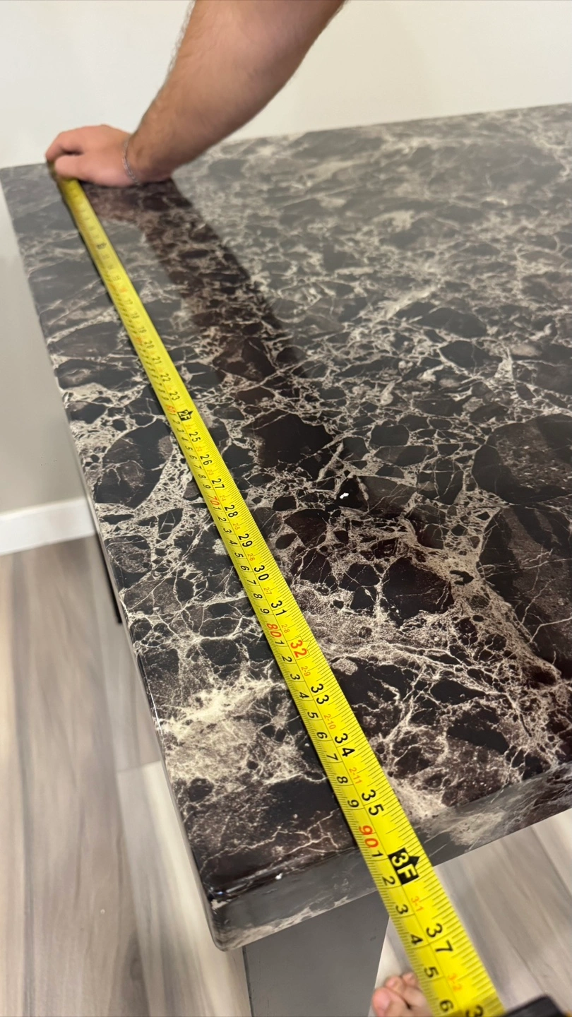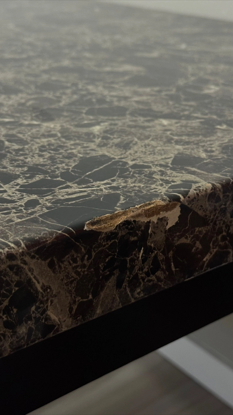 Selling a dining table with a faux marble top and black legs. There is some wear and tear on the corner of the table, as shown in the pictures. Still a very stylish piece! All chair just for gift!๐