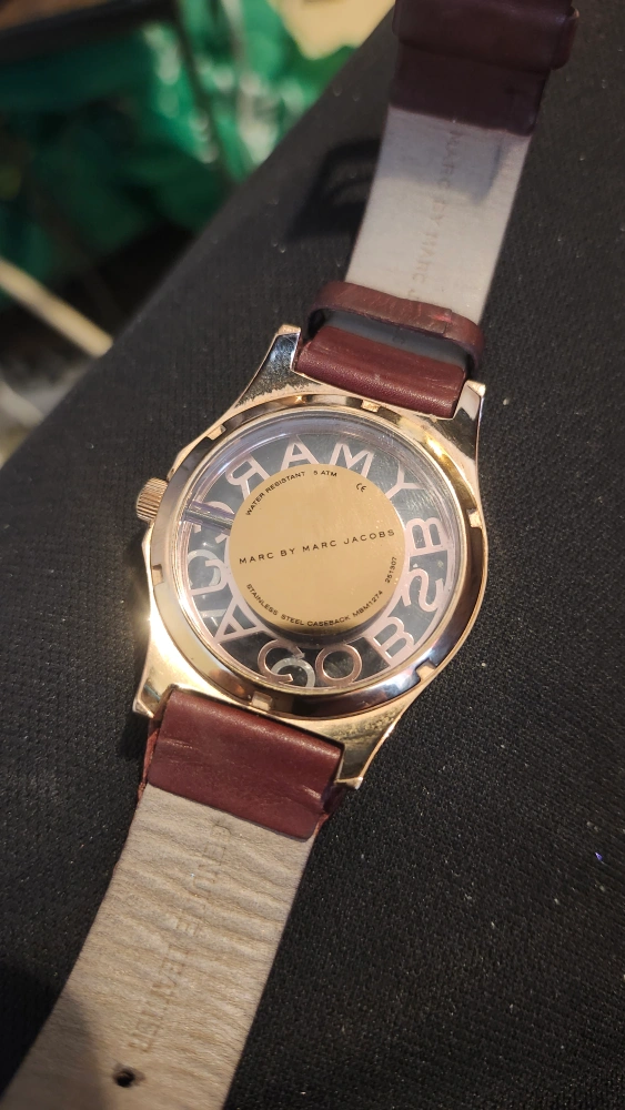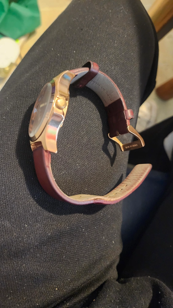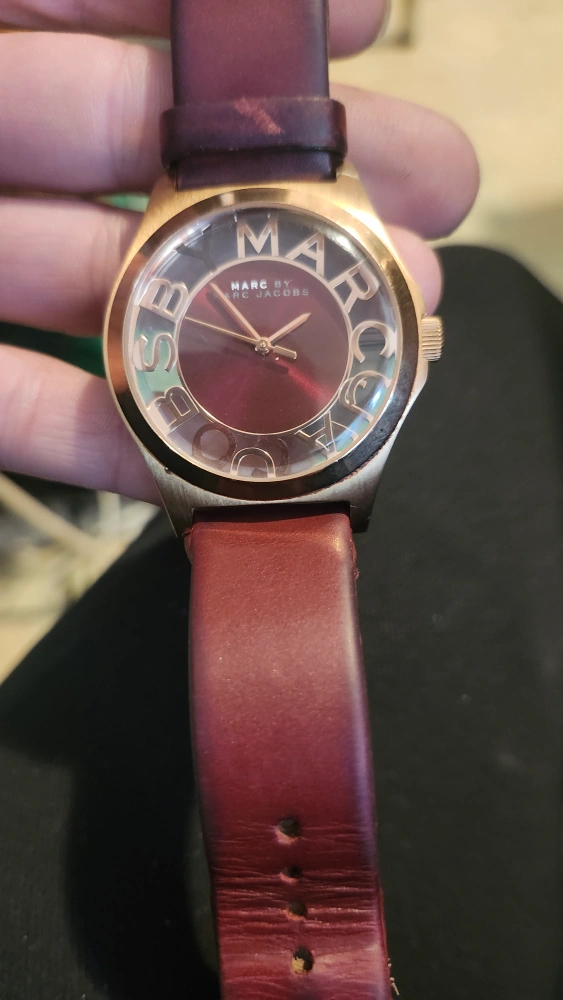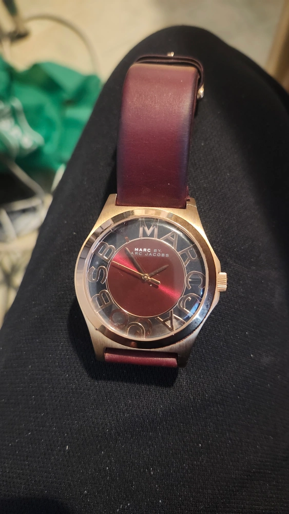 Selling a Marc by Marc Jacobs men's watch. It has a burgundy leather strap and a rose gold-tone case. The watch shows some signs of wear on the strap, but the face is in good condition. It's a stylish timepiece that's sure to add a touch of elegance to any outfit
