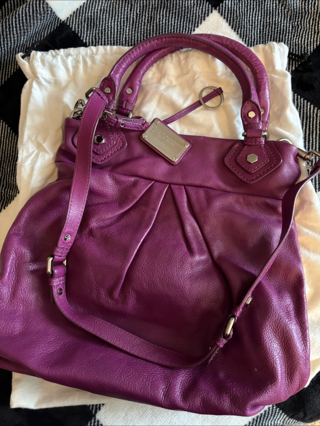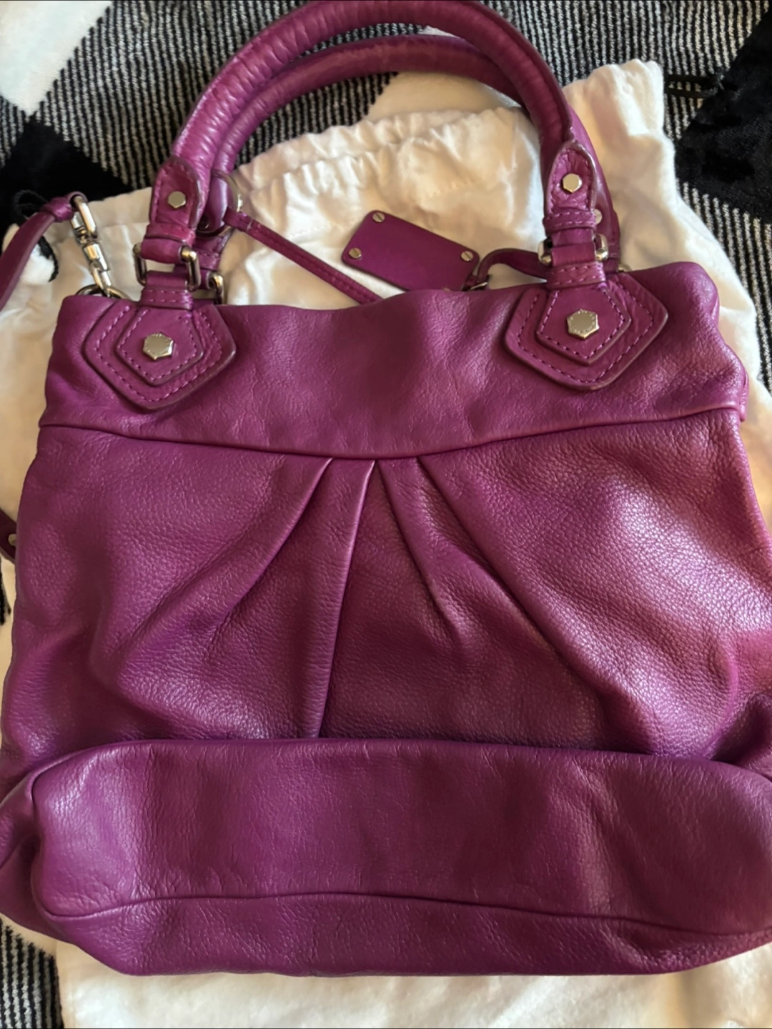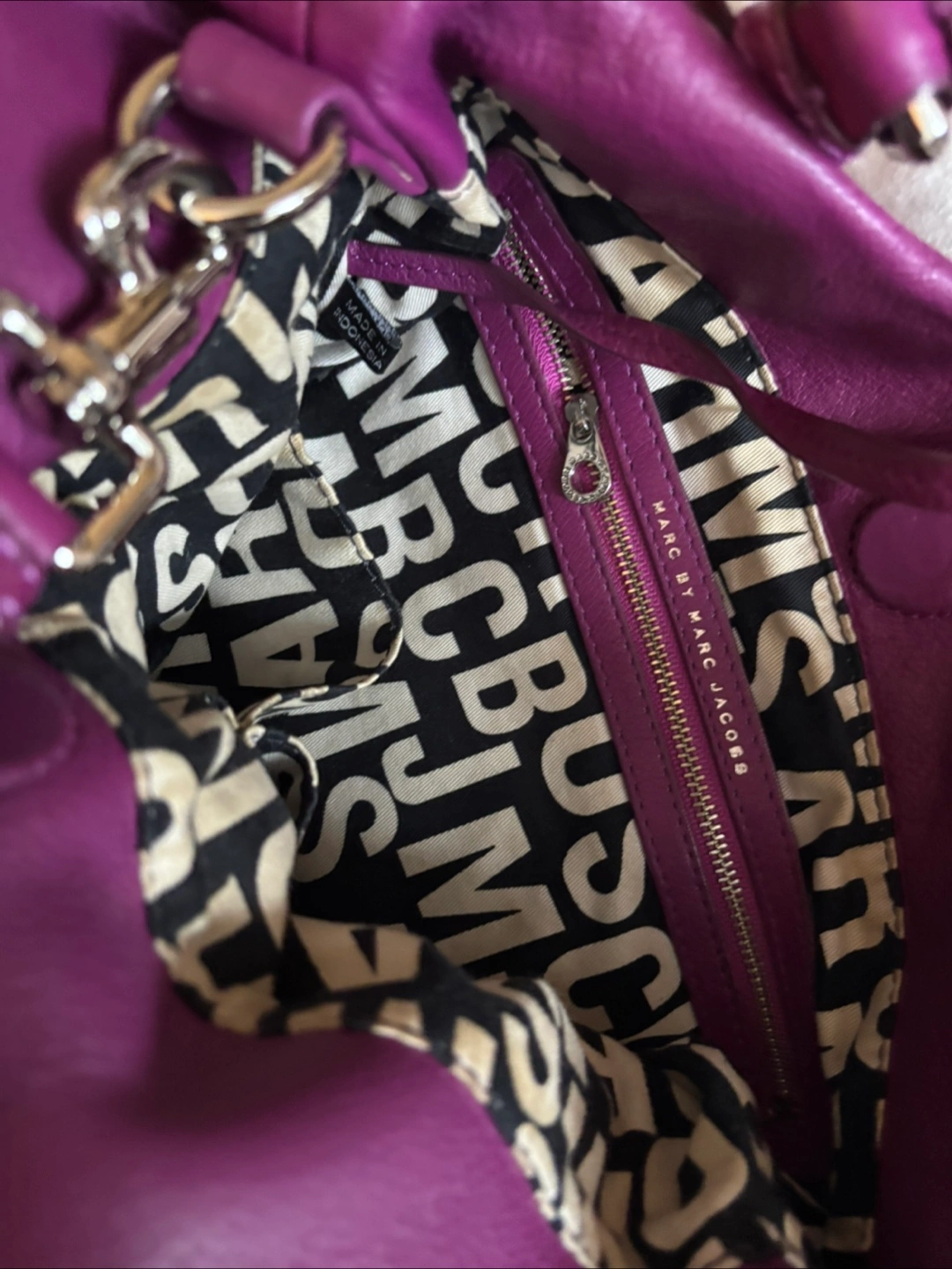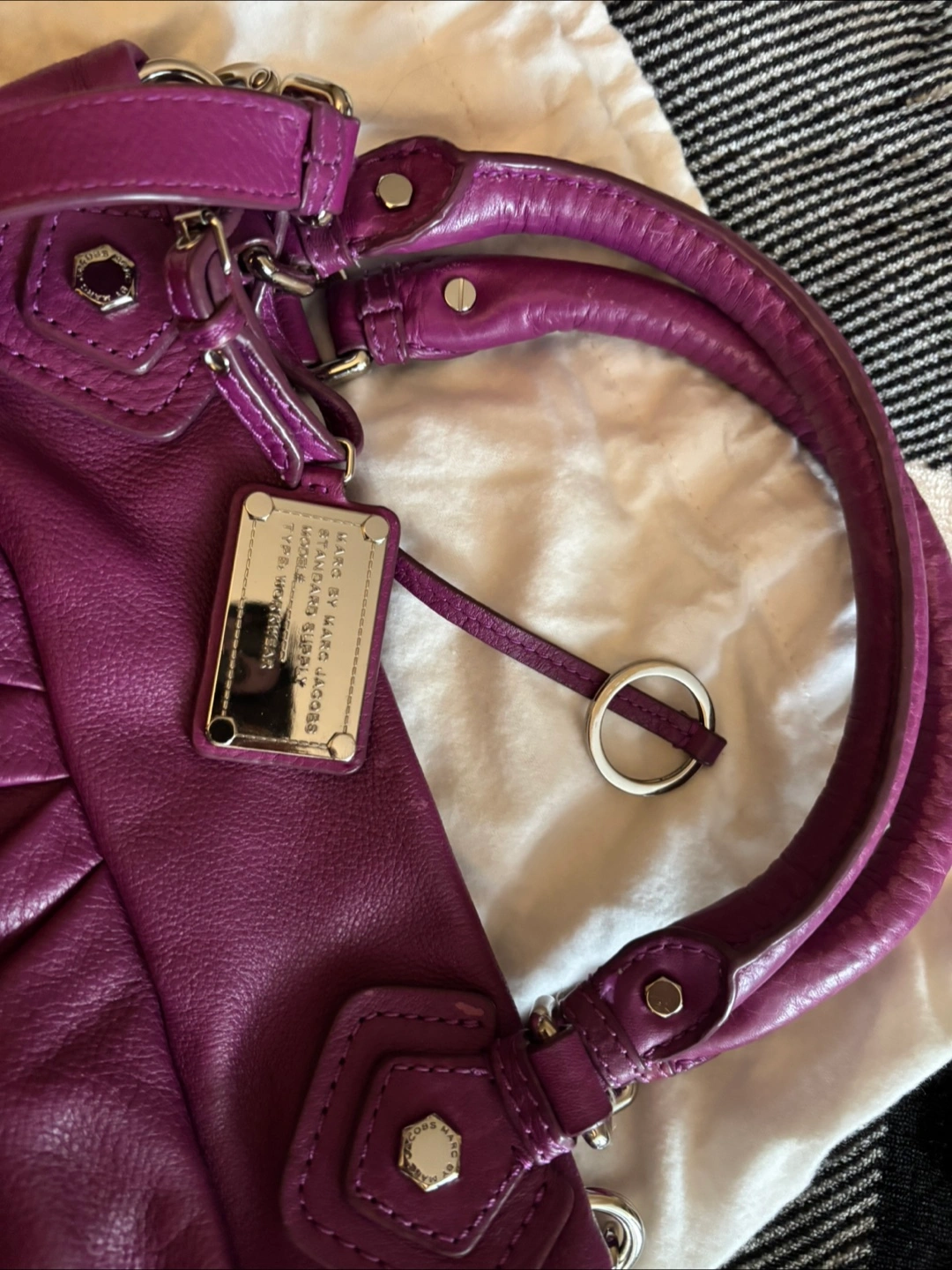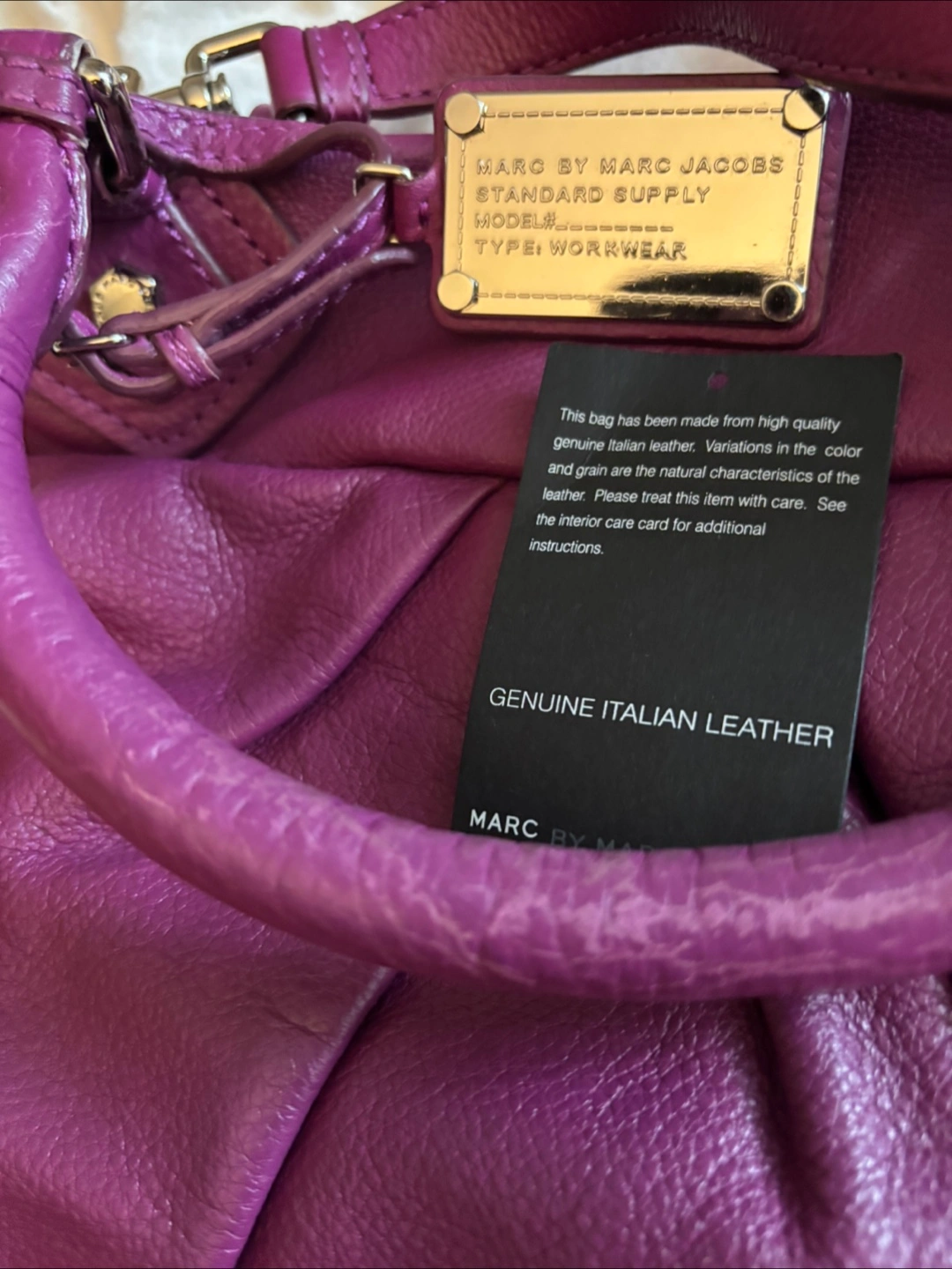 Gorgeous purple leather handbag. Double handles and a shoulder strap. Genuine Italian leather. Interior features Marc by Marc Jacobs branding. Dust bag included.