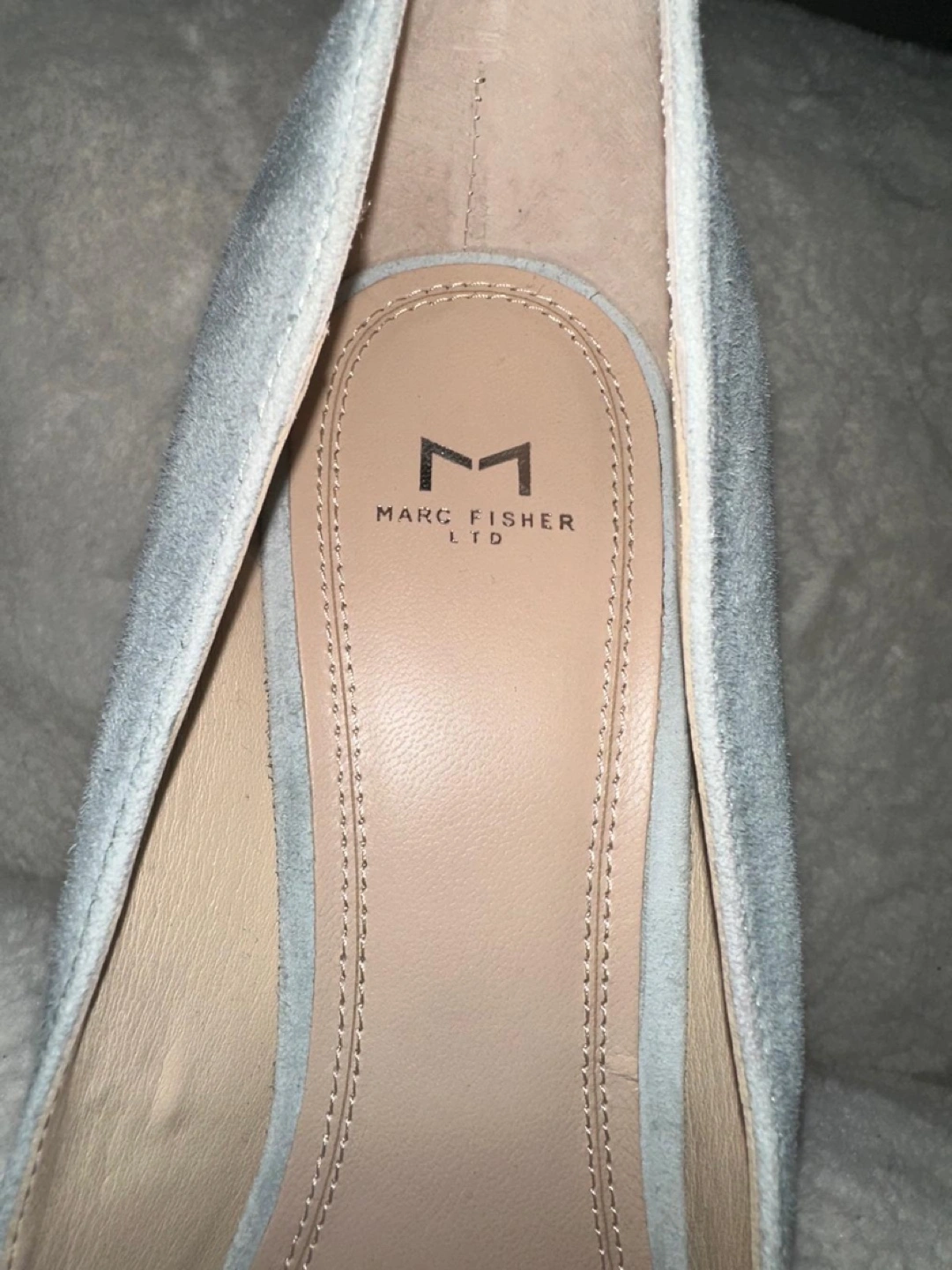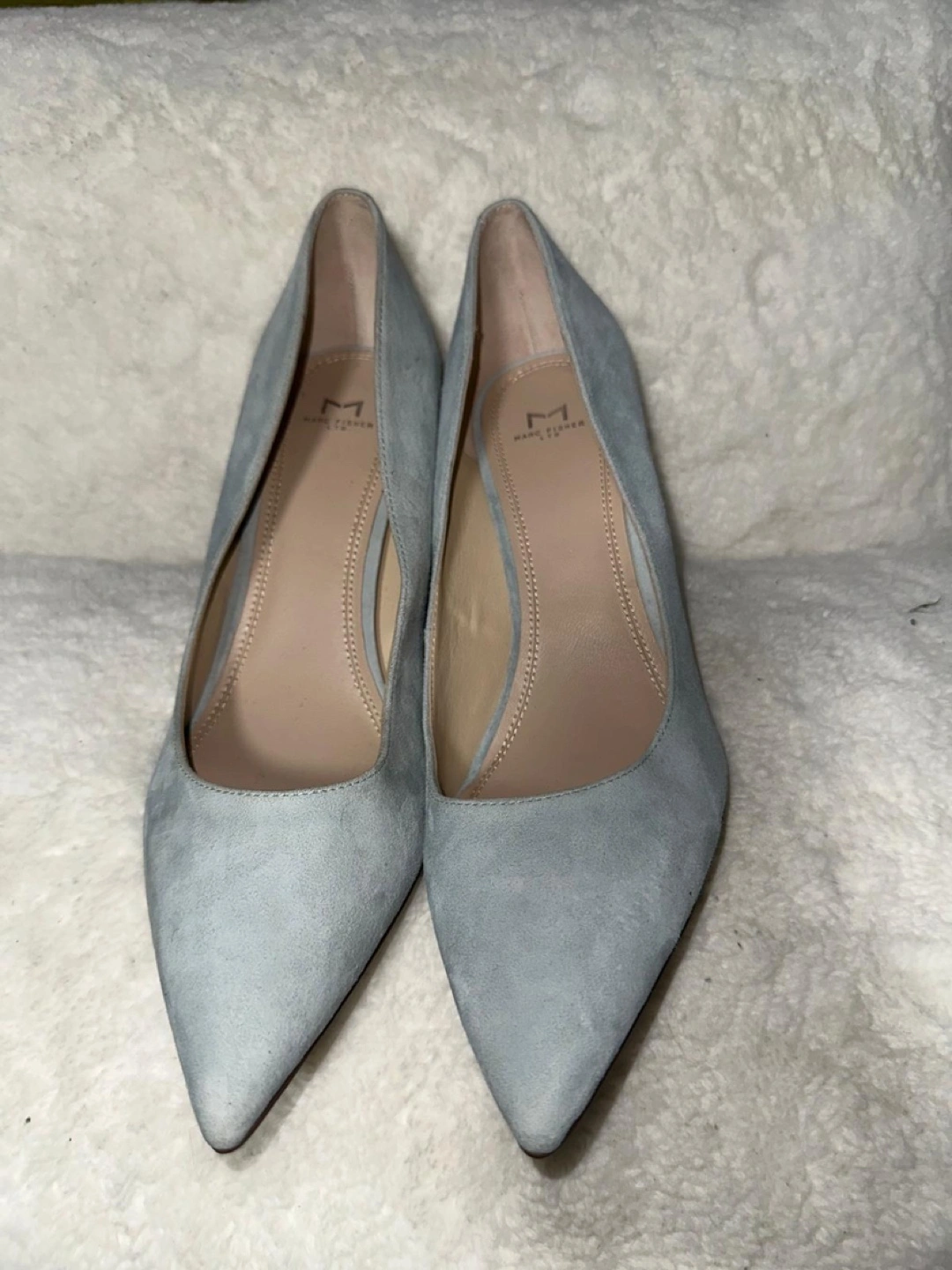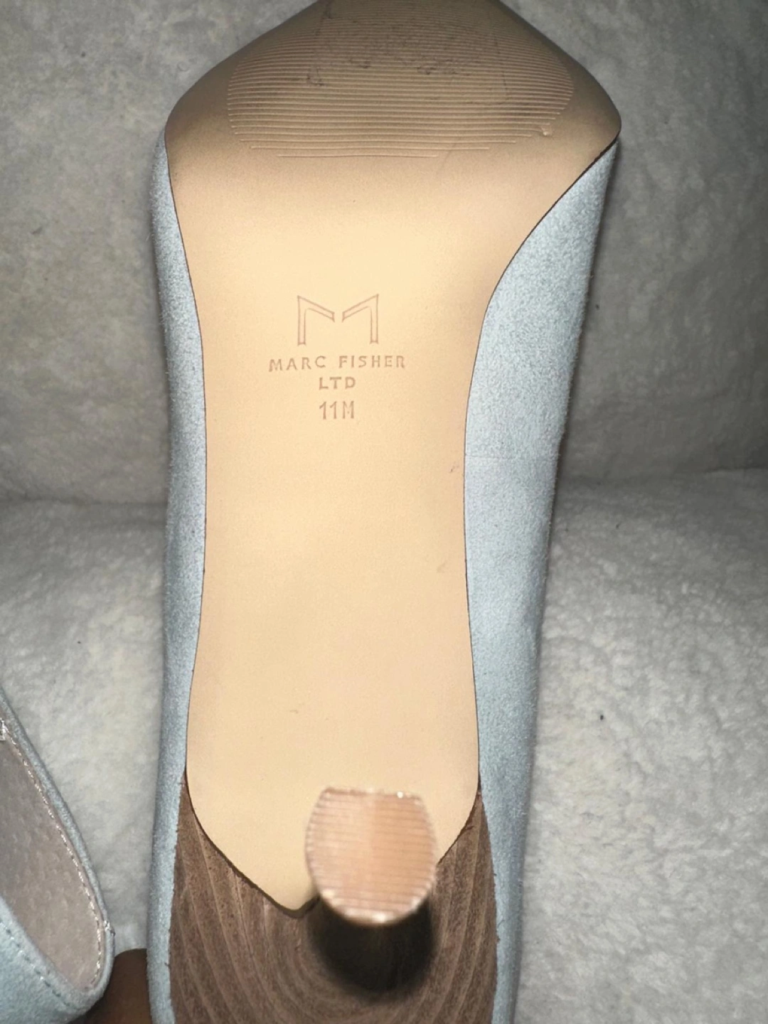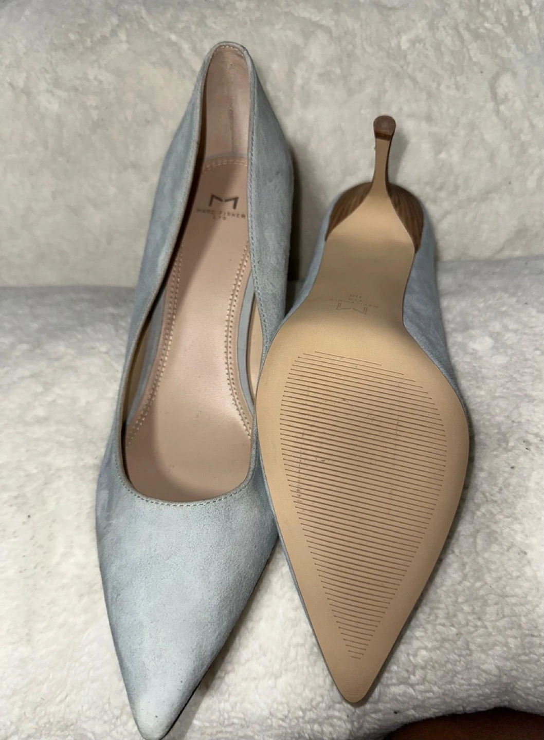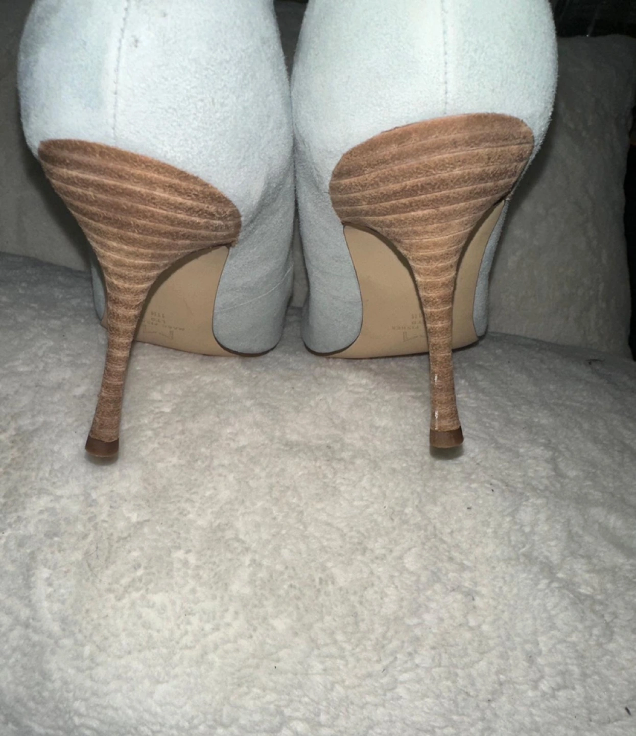 Pair of light blue suede heels. Pointed toe. Wooden heels. Size 11M.