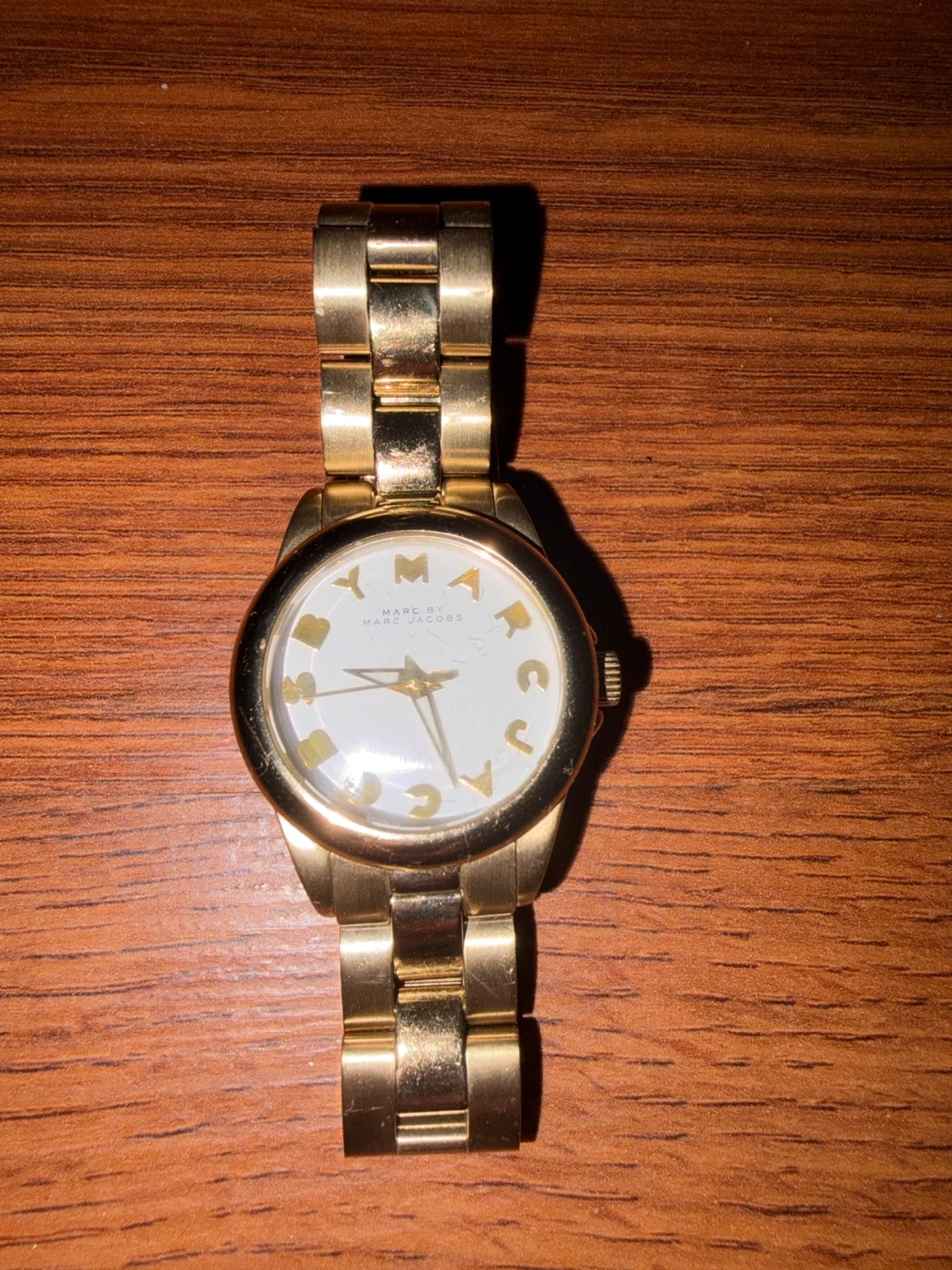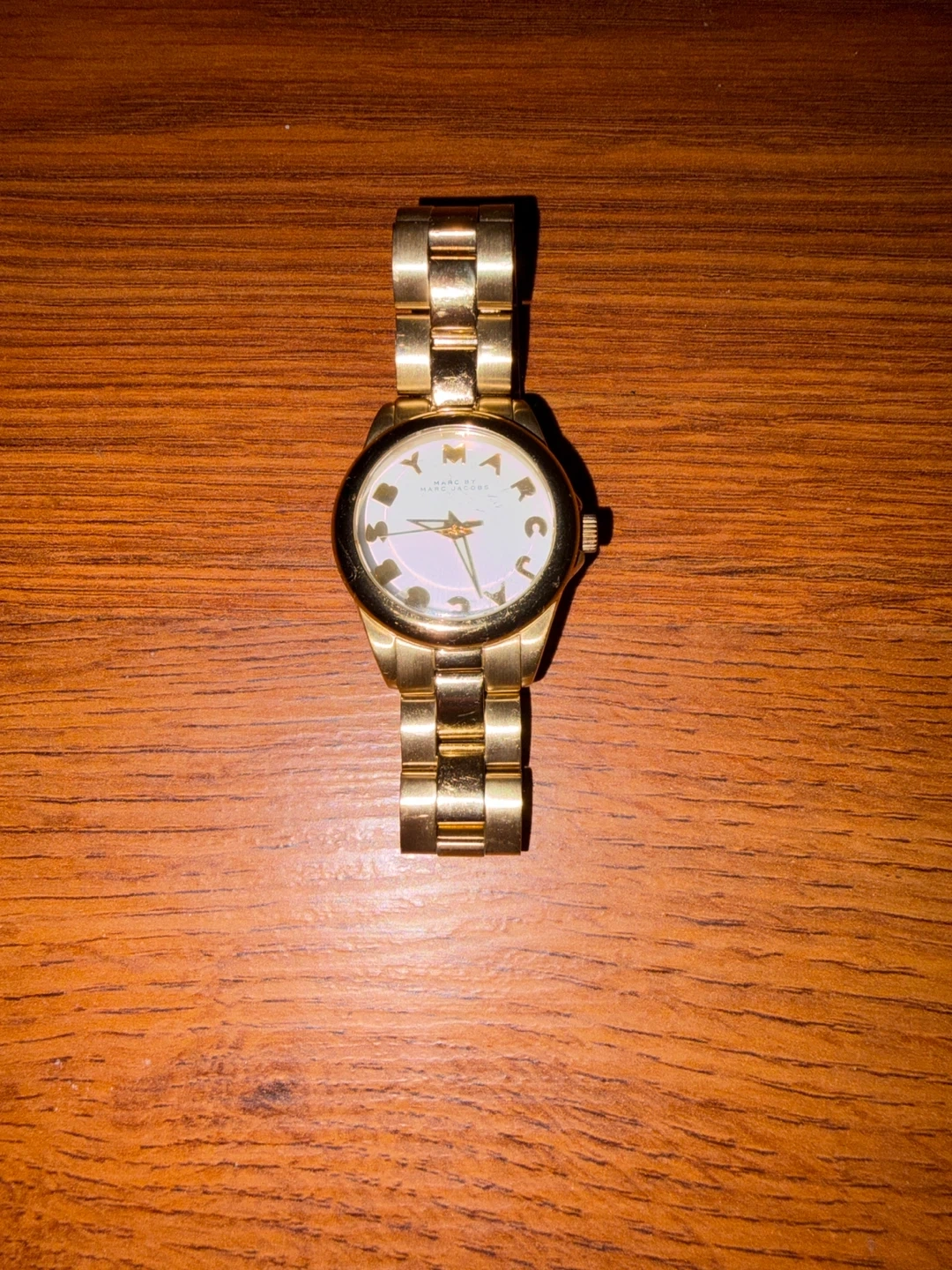 Selling a Marc Jacobs gold watch. It's in good condition and has a unique design on the face. It would make a great addition to any outfit!