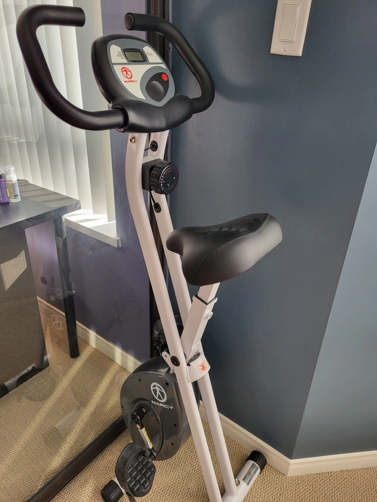 Compact exercise bike, folds for storage. Digital display shows speed, distance, time, and calories burned. Adjustable resistance knob. Great for home workouts. Very lightly used. Smoke and pet free home