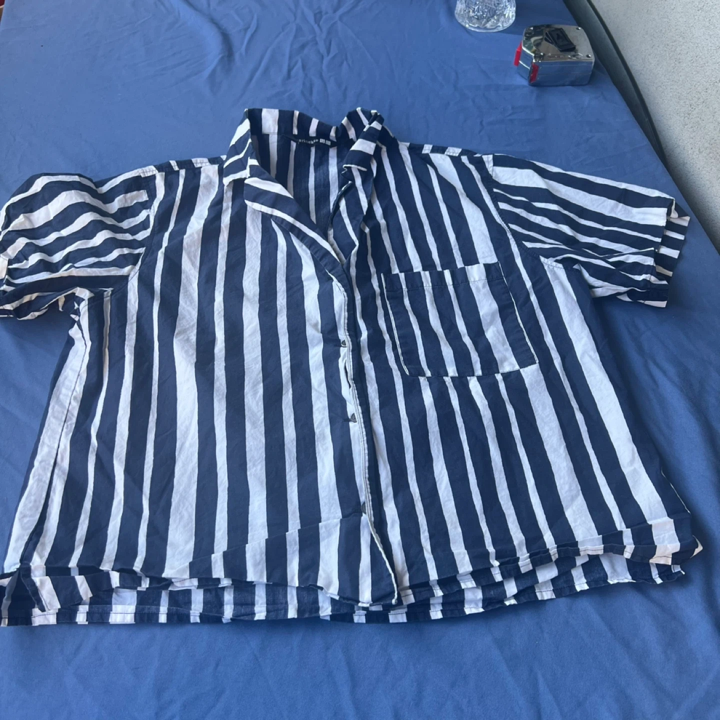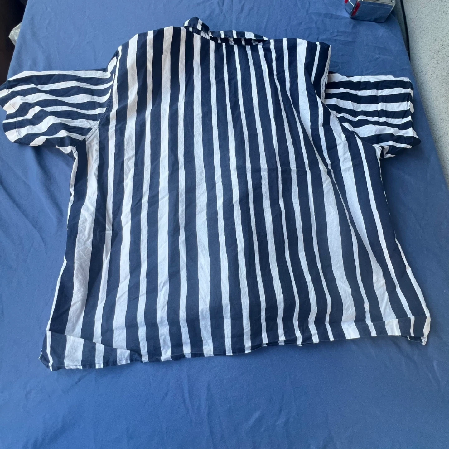 Selling a cute Marimekko x Uniqlo striped shirt! It's a size XS and features a classic blue and white stripe pattern. Perfect for a casual look or dressing up a bit. In great condition!
