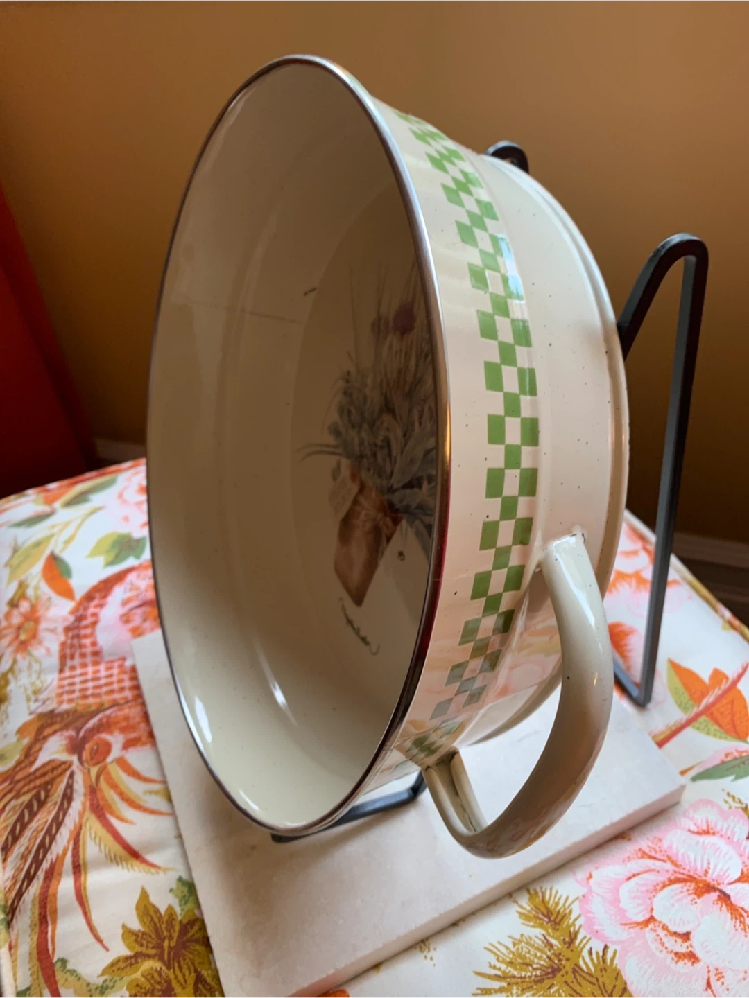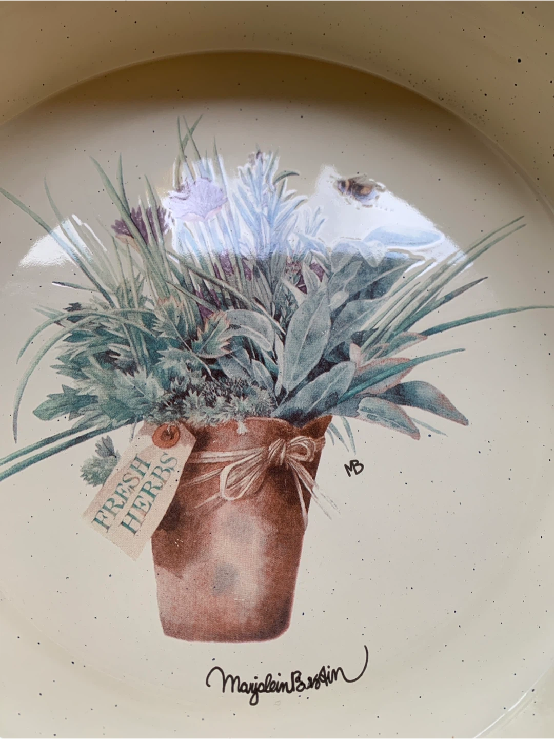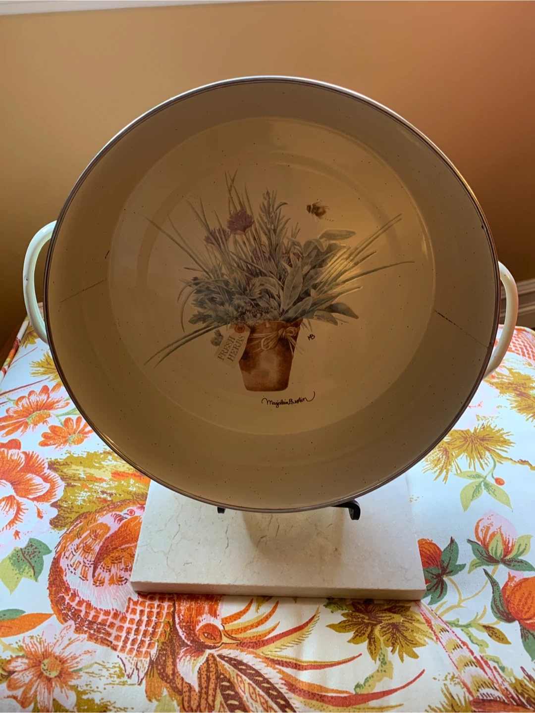 A lovely round enamel tray featuring a Marjolein Bastin design with fresh herbs. It has a cream-coloured background with a charming floral and bee illustration in the centre. Around the tray, there is a green and cream checked pattern. Perfect for serving or as a decorative piece for your home. It was probably introduced by Hallmark…her beautiful plant and garden cards were sold there as well. A nice addition to your kitchen decor! Cash only please.
