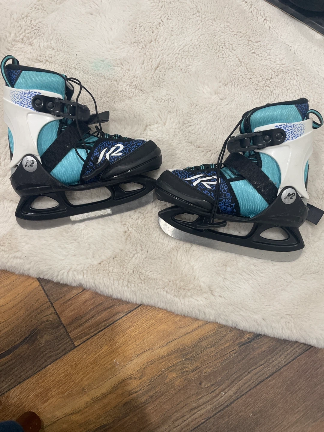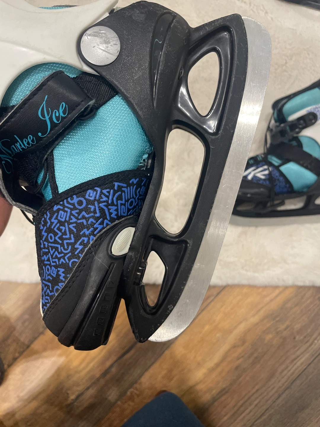 Selling a pair of Marlee Ice K2 ice skates. These skates are in great condition and are a US size 11-2, which corresponds to EUR 29-34 and CM 17-20. They feature a stylish black, white, and turquoise design. Perfect for hitting the ice this winter!