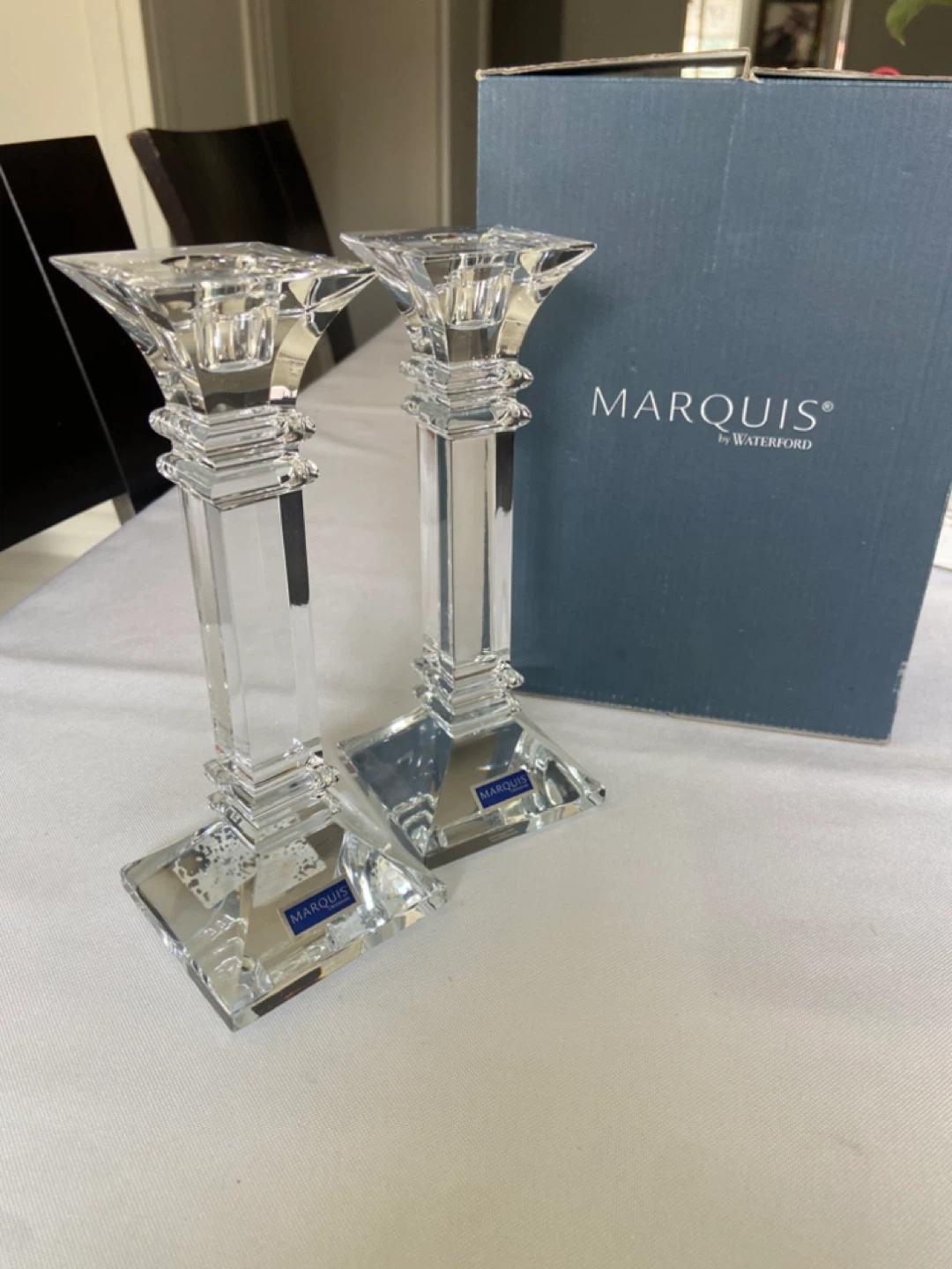 Selling a beautiful pair of Marquis by Waterford crystal candlesticks! They're in great condition and come with the original box. These would look lovely on any table or mantelpiece. They add a touch of elegance to any room