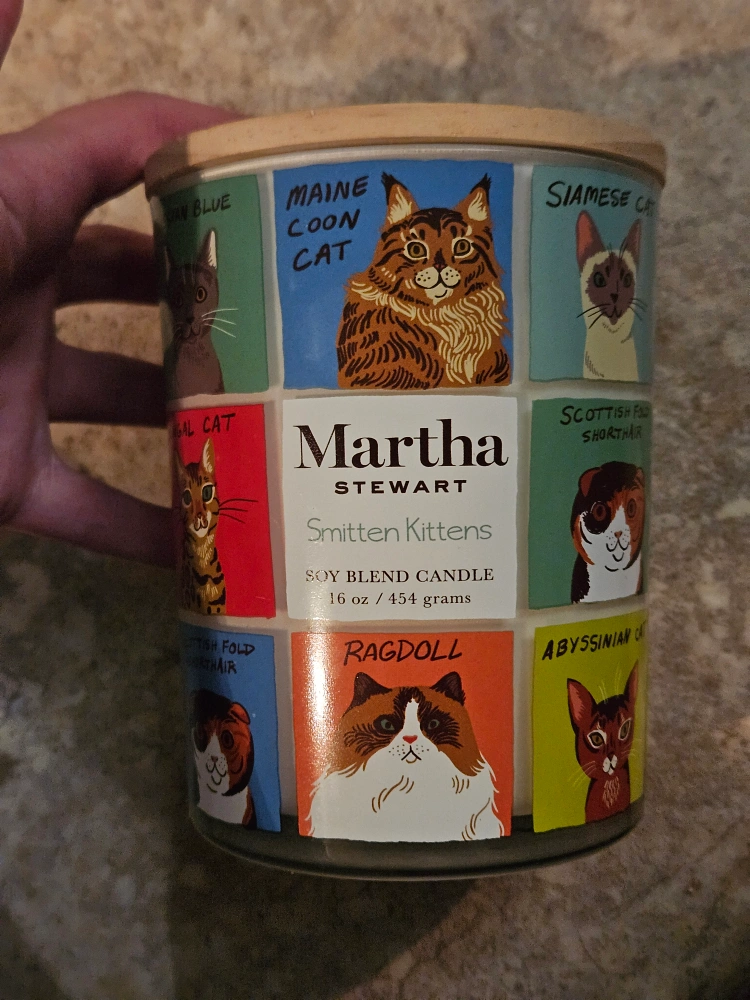 Selling a Martha Stewart 'Smitten Kittens' soy blend candle! It's a 16 oz / 454 grams candle featuring cute cat breeds on the label. This candle would be perfect for any cat lover has been used once or twice