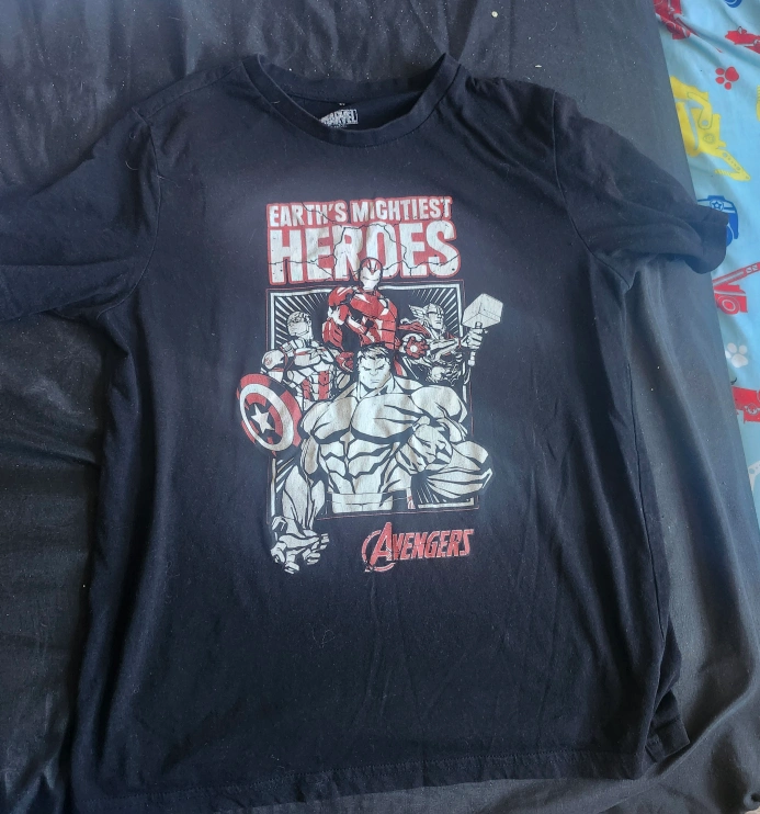 Selling a Marvel Avengers T-shirt featuring Earth's Mightiest Heroes! The shirt is black and has a graphic print of the Avengers team. Perfect for any Marvel fan!