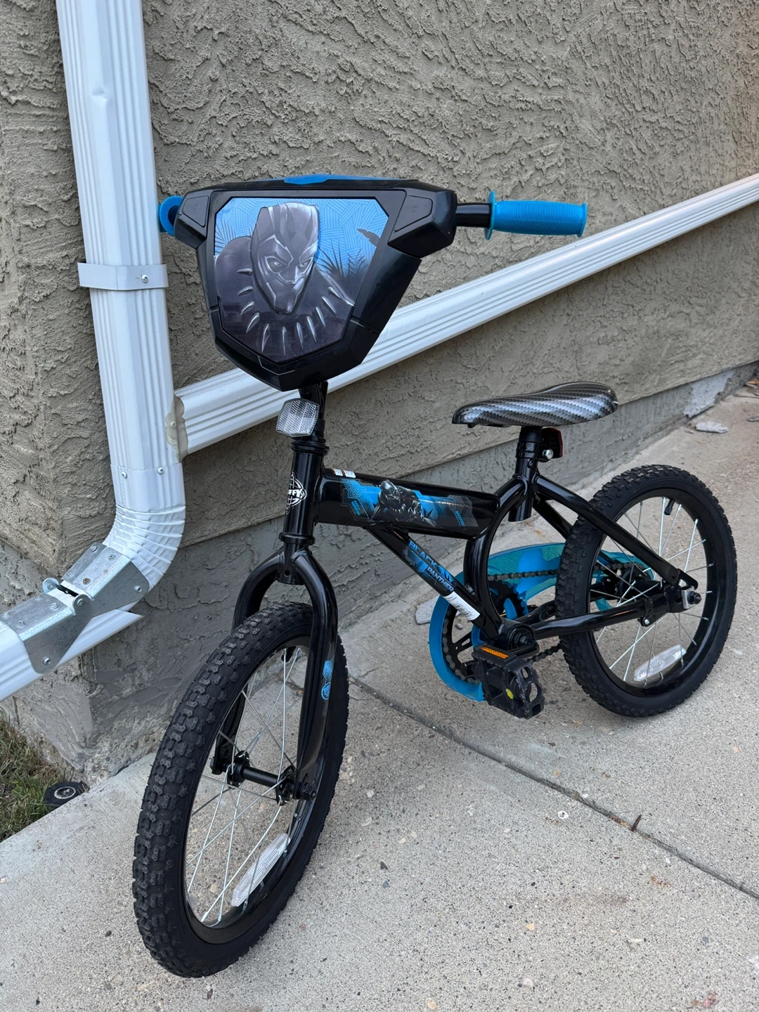 Selling a Marvel Black Panther 16-inch bike for kids! It's in good condition and ready for a new rider. The bike features cool Black Panther graphics and is perfect for young fans of the superhero.