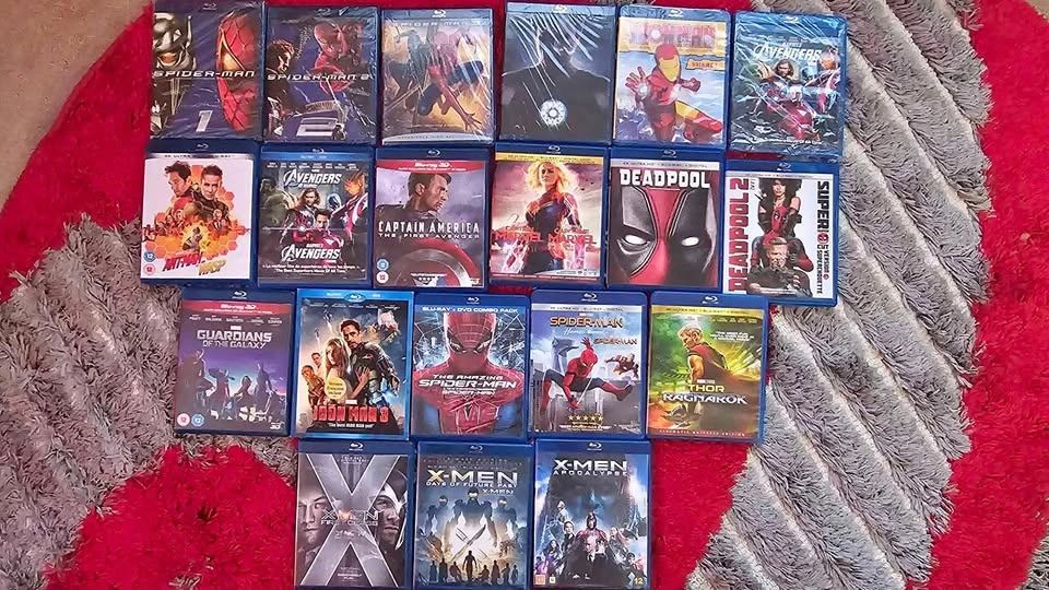 Selling Marvel Blu-rays from my personal collection. The top row are sealed. The rest of the discs are brand new and never used. They are from 3D combo packs and 4K combo packs that I double dipped. $10 IRONMAN ULTIMATE 2 DISC -SEALED IRONMAN ARMORED ADVENTURES- SEALED MARVELS AVENGERS - SEALED. BLU RAY +DVD $8 ANTMAN &THE WASP- NEW 2D BLU RAY FROM 4K COMBO PACK MARVEL AVENGERS - OPEN CAPTAIN AMERICA THE FIRST AVENGER-NEW 2D DISC FROM 3D COMBO CAPTAIN MARVEL- NEW 2D BLU RAY FROM 4K COMBO PACK. DEADPOOL- NEW 2D BLU RAY FROM 4K COMBO DEADPOOL 2- NEW 2D BLU RAY FROM 4K COMBO GUARDIANS OF THE GALAXY- NEW 2D BLU RAY FROM 3D COMBO. IRONMAN 3- OPEN THOR THE DARK WORLD-NEW 2D BLU RAY FROM 4K COMBO. THOR RAGNAROK- NEW 2D BLU RAY FROM 4K COMBO. X MEN FIRST CLASS X MEN DAYS OF FUTURE PAST- NEW 2D BLU RAY FROM 3D COMBO X MEN APOCALYPSE - NEW SEALED.