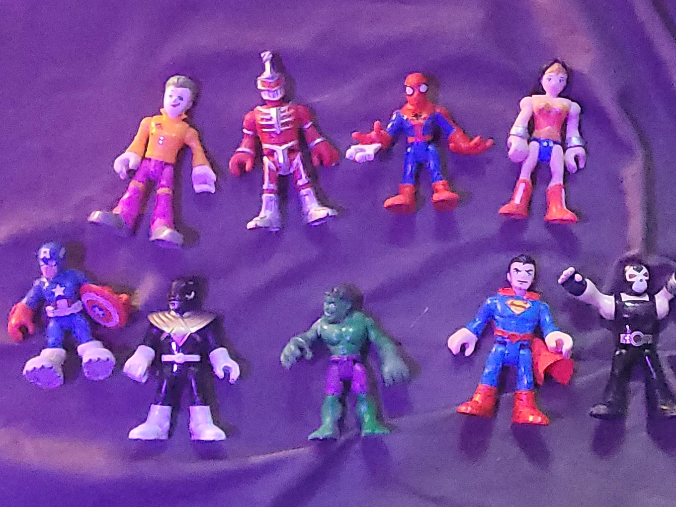Selling a set of Marvel and DC super hero figures! Includes characters like Spider-Man, Wonder Woman, Captain America, Hulk, Superman, and more! Great for kids or collectors