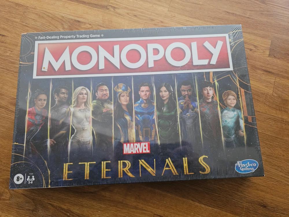 New, sealed Monopoly board game featuring Marvel's Eternals. Includes game board, playing pieces, and cards. Ages 8+. Fast-dealing property trading game. Go on a journey through time with the Eternals.