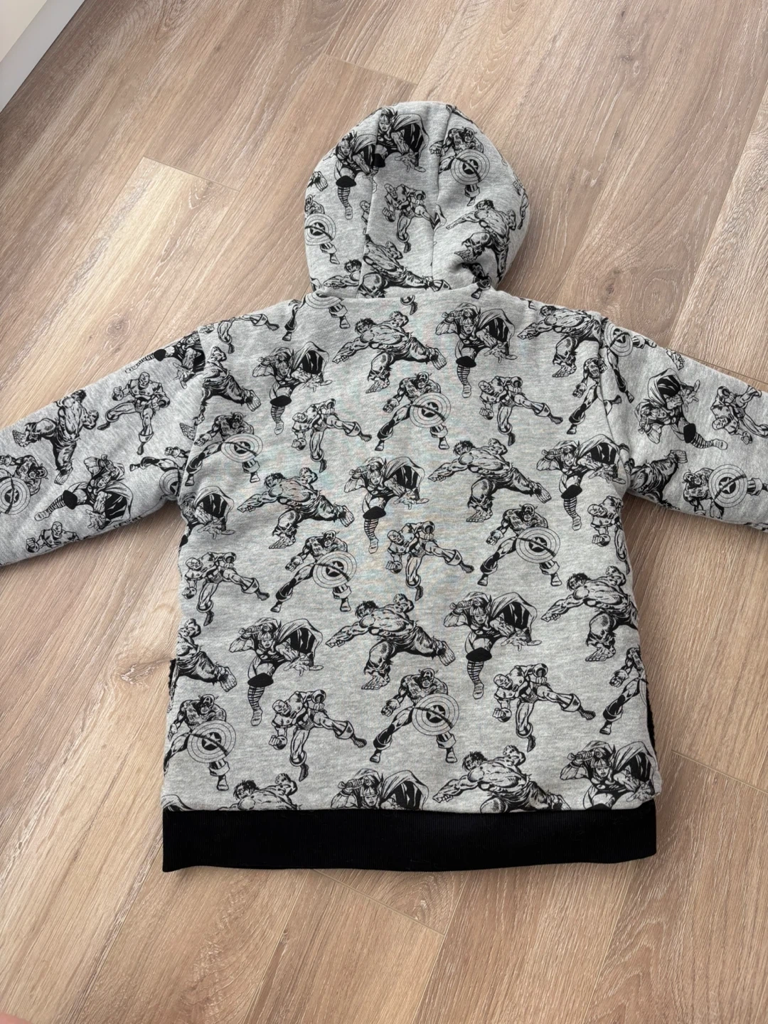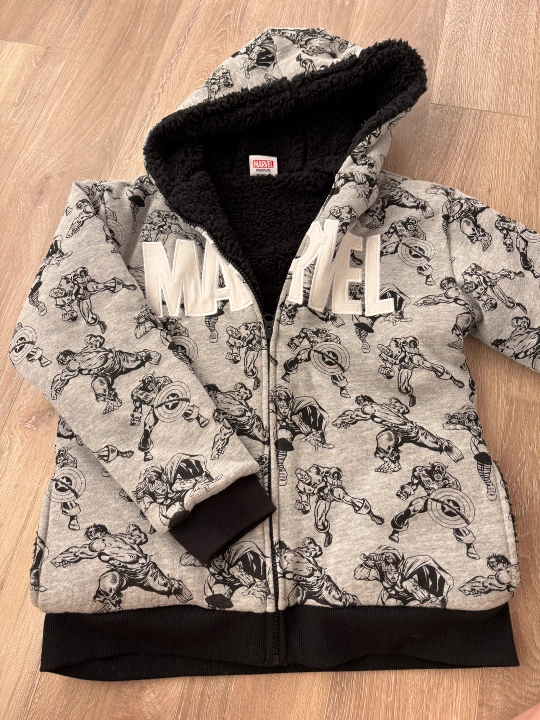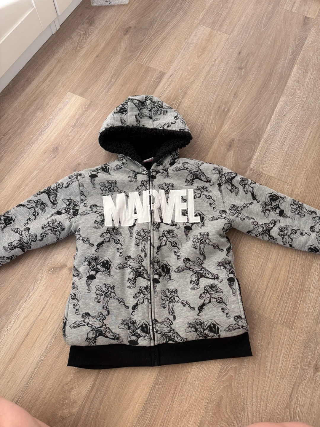 Super warm Marvel hoodie. The inside is lined with a soft fluffy fleece, perfect for keeping cozy. The shell is 60% cotton and 40% polyester, while the lining is 100% polyester. size L (10/12). It features a fun all-over print of Marvel characters. New without tags.