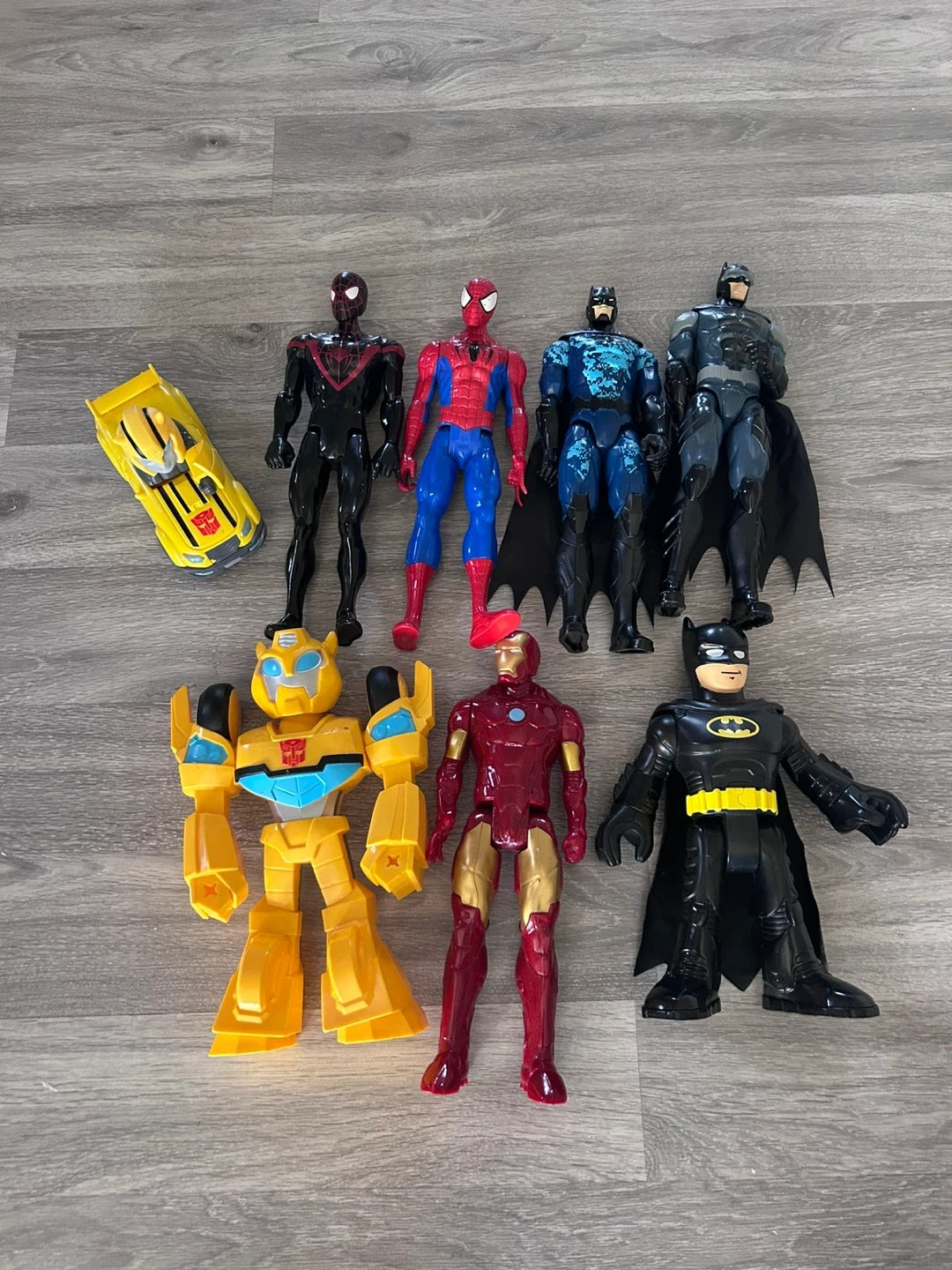 Selling a collection of action figures! Includes characters from Marvel (Spiderman, Miles Morales, Iron Man, Batman) and Transformers (Bumblebee). Great for kids or collectors!