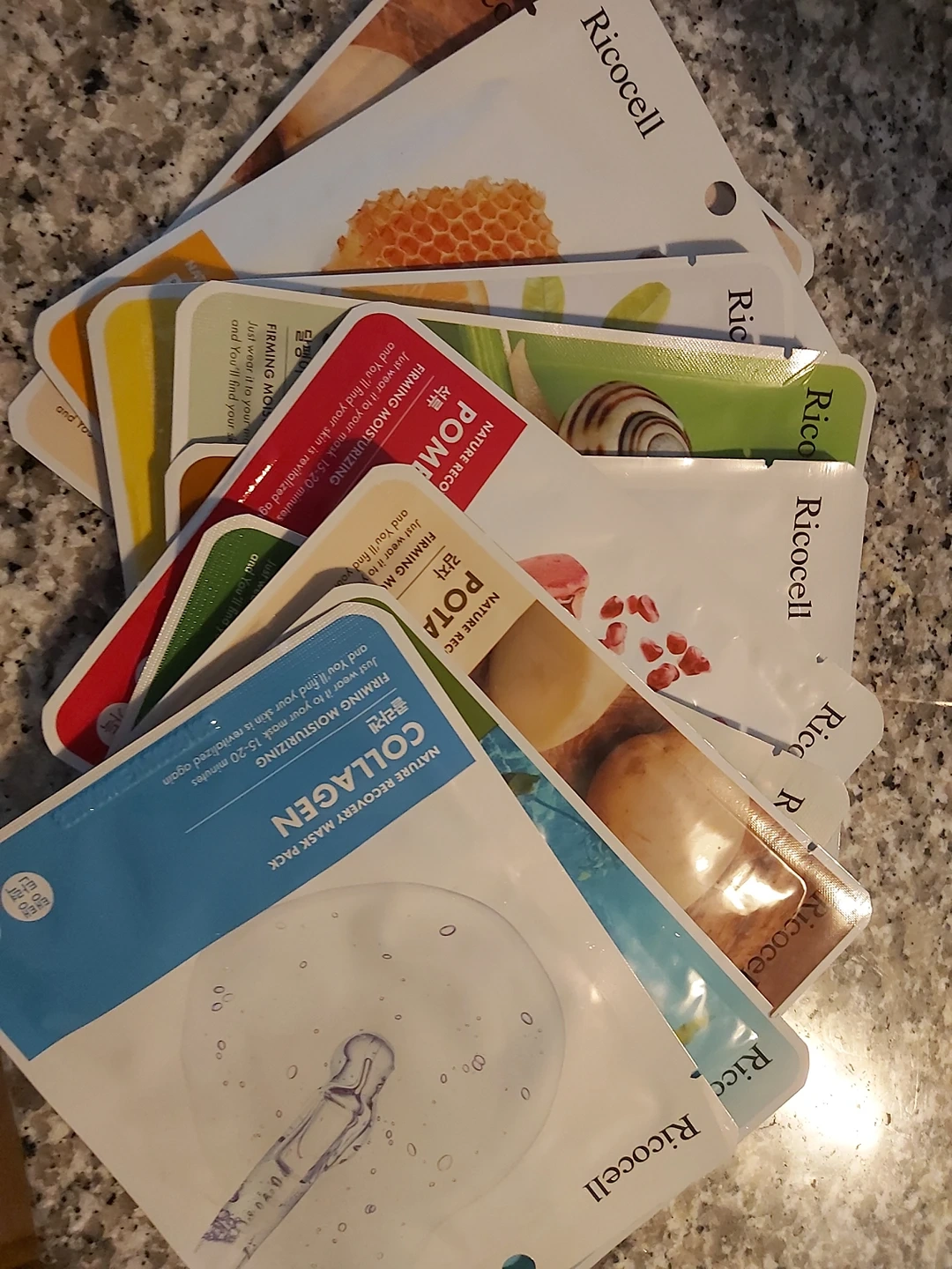 Made in Korea, mask pack 12p (Royal jelly2, vitamin1, snail1, rice2, pomegranate1, aloe1, potato1, sea weed1, collagen2) EXP day : 2025 03 13