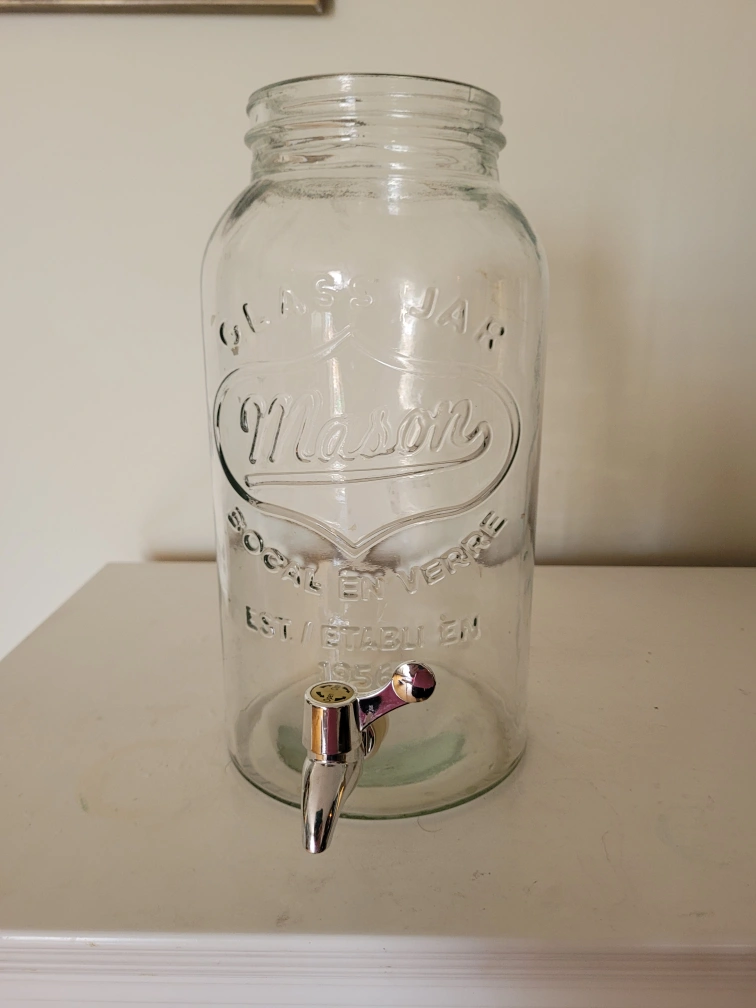 Selling a glass jar drink dispenser from Mason. It's in great shape and perfect for parties or everyday use! The jar is clear glass with a metal spigot. It's ideal for serving lemonade, iced tea, or any other beverage