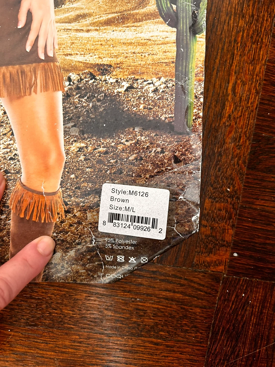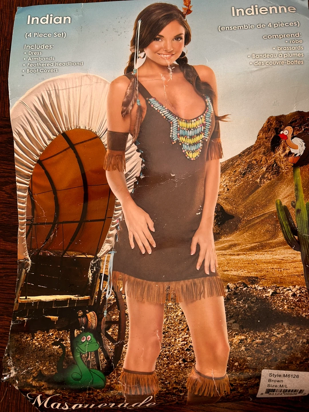 Selling a Masquerade Indian costume. IThe style is M6126, and the size is M/L. The costume is brown and made of 95% polyester and 5% spandex