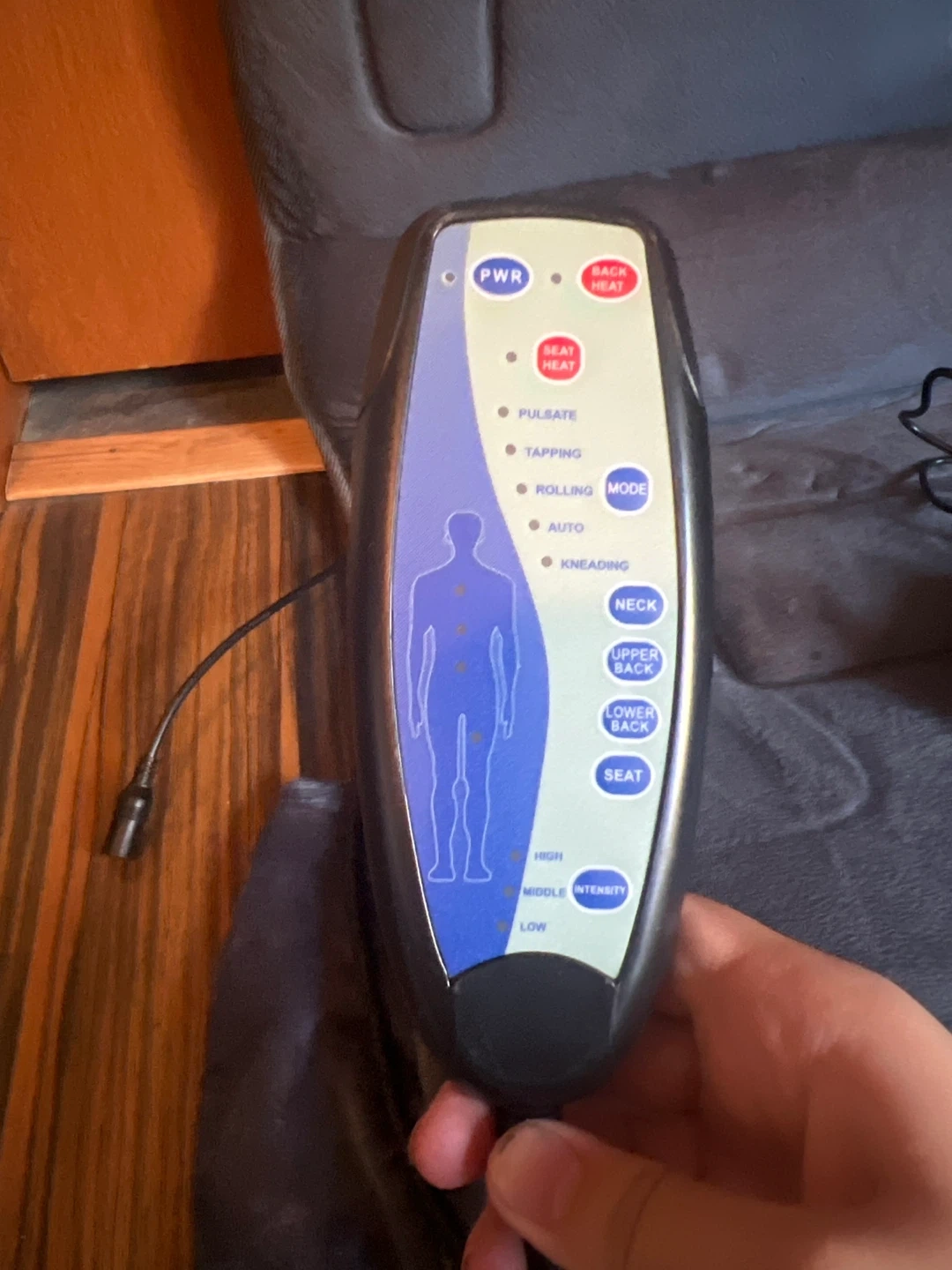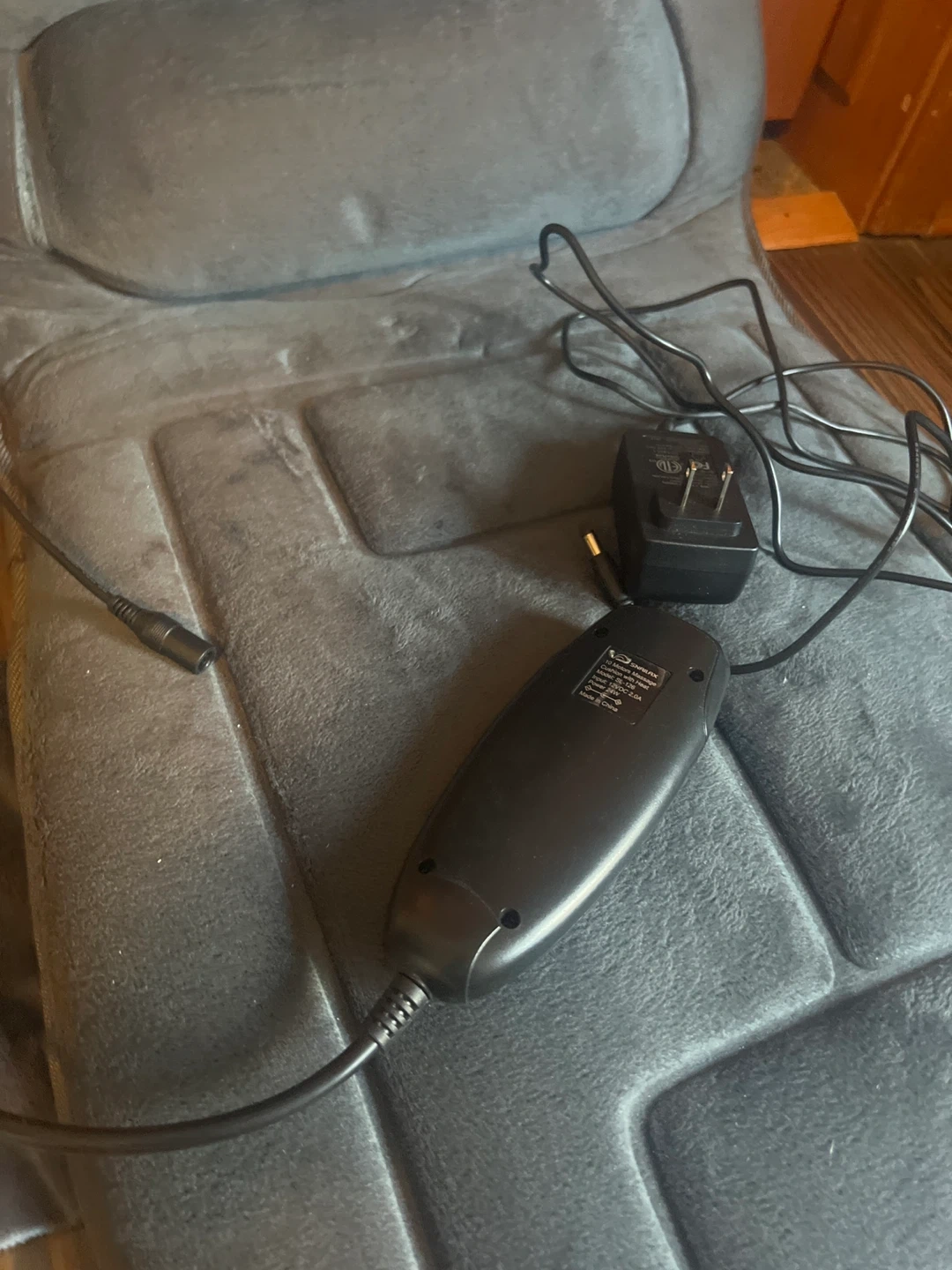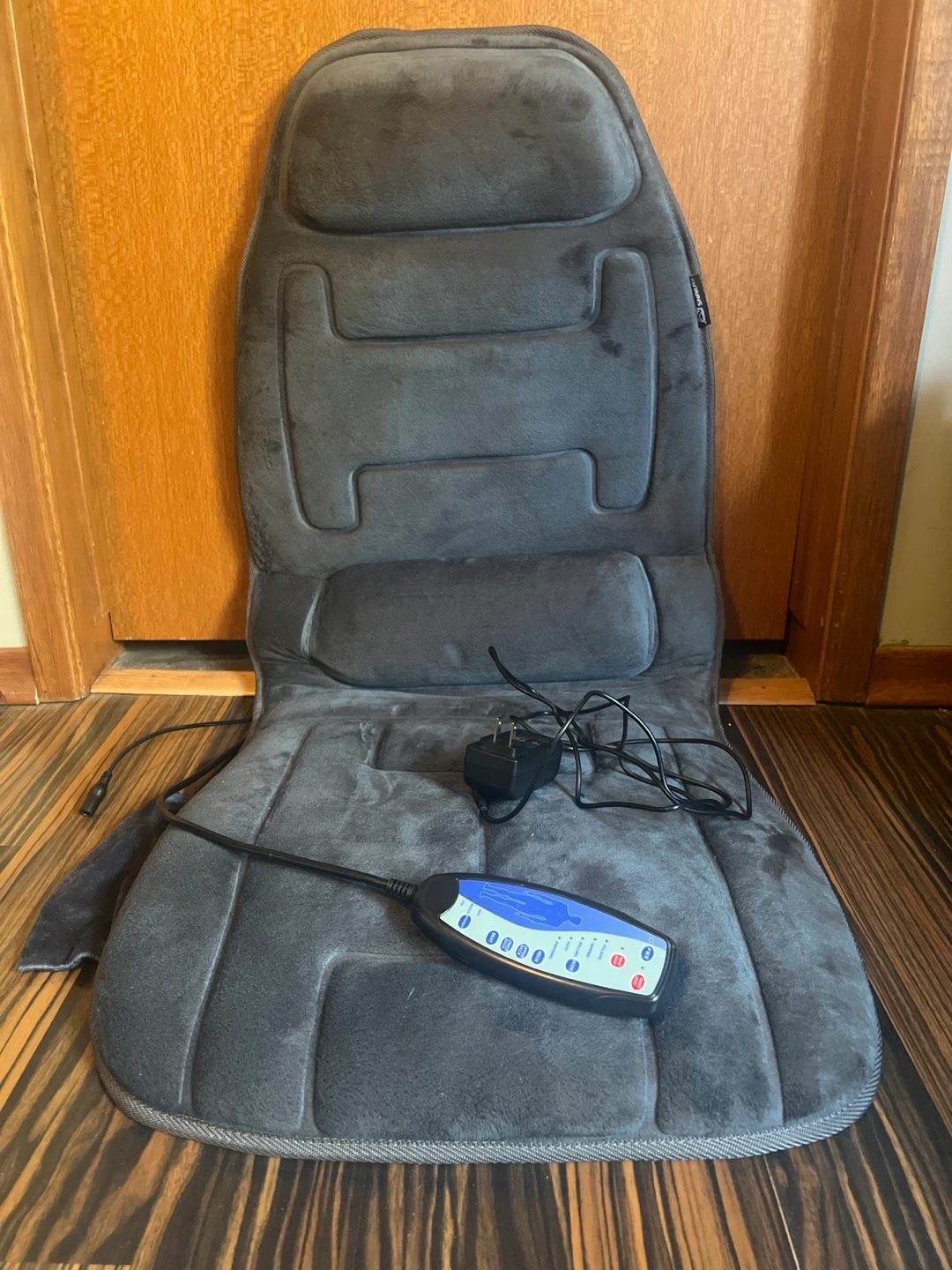 Selling a massage chair pad with heat! It comes with a remote control and power adapter. It looks like it's in good condition and ready to help you relax after a long day. Perfect for adding a massage feature to any chair!