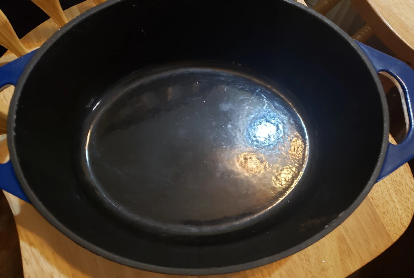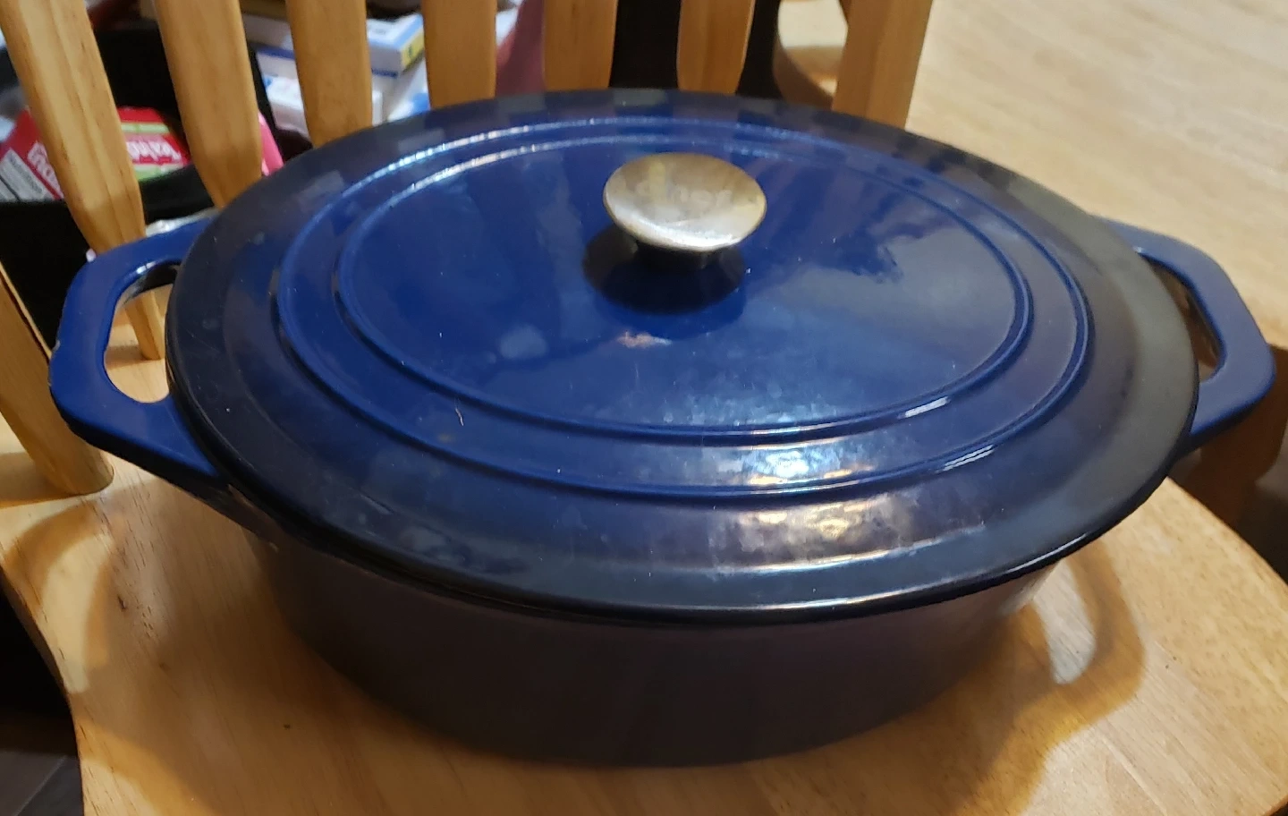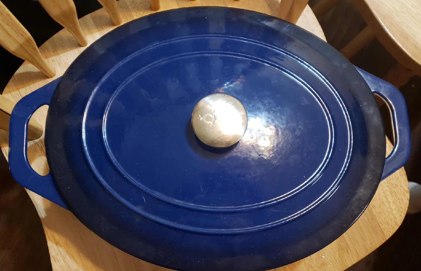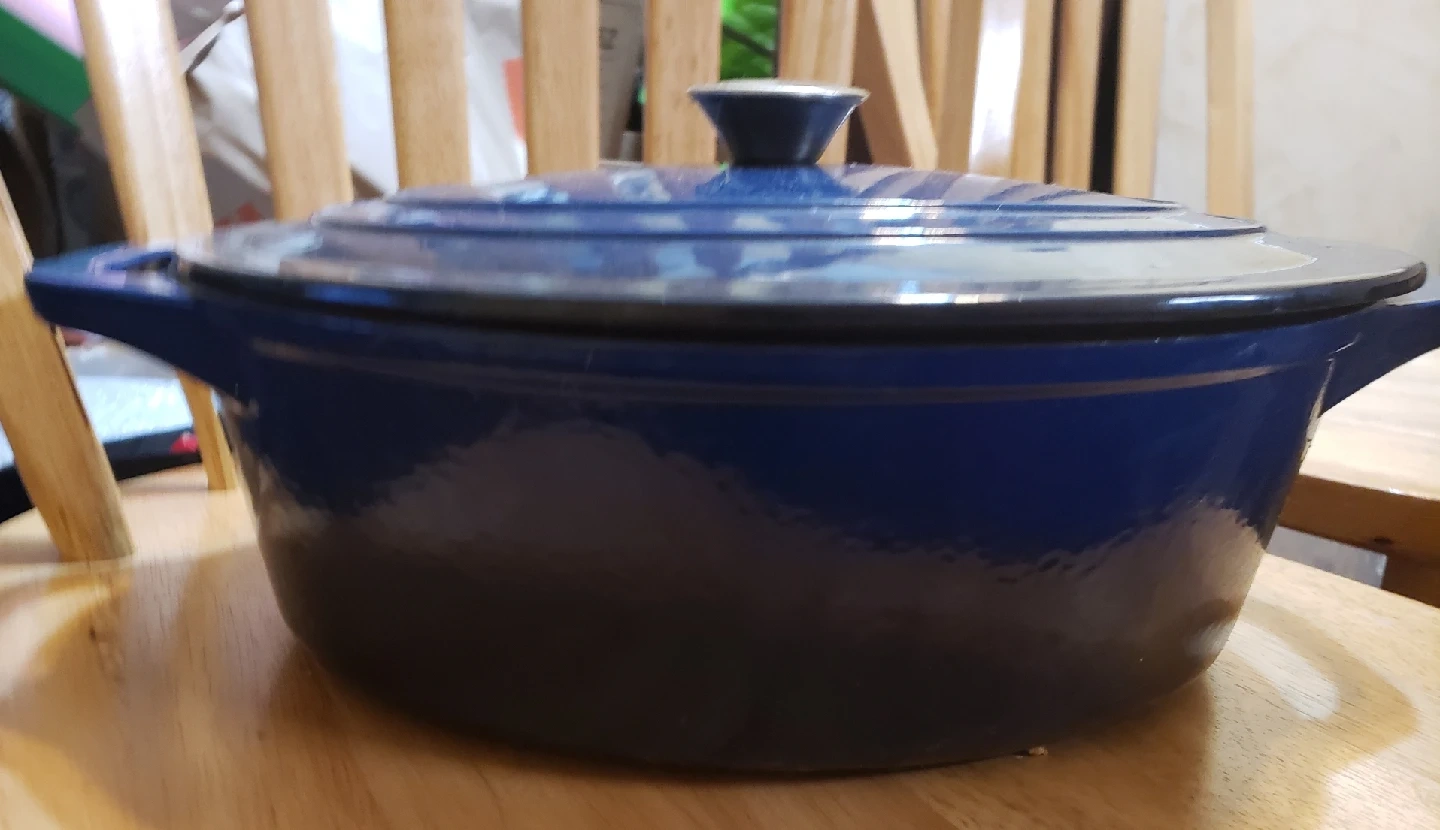 Selling a blue enameled cast iron Dutch oven. It's in good condition and perfect for cooking up your favourite meals! There are some signs of use on it but all in all not too bad.