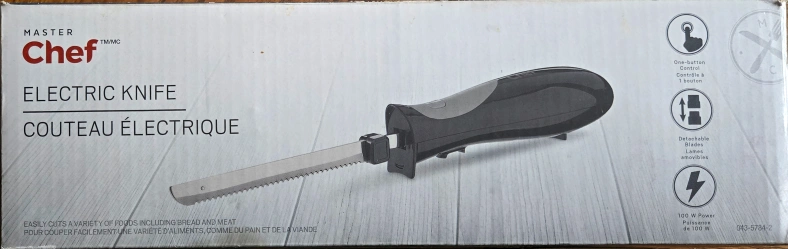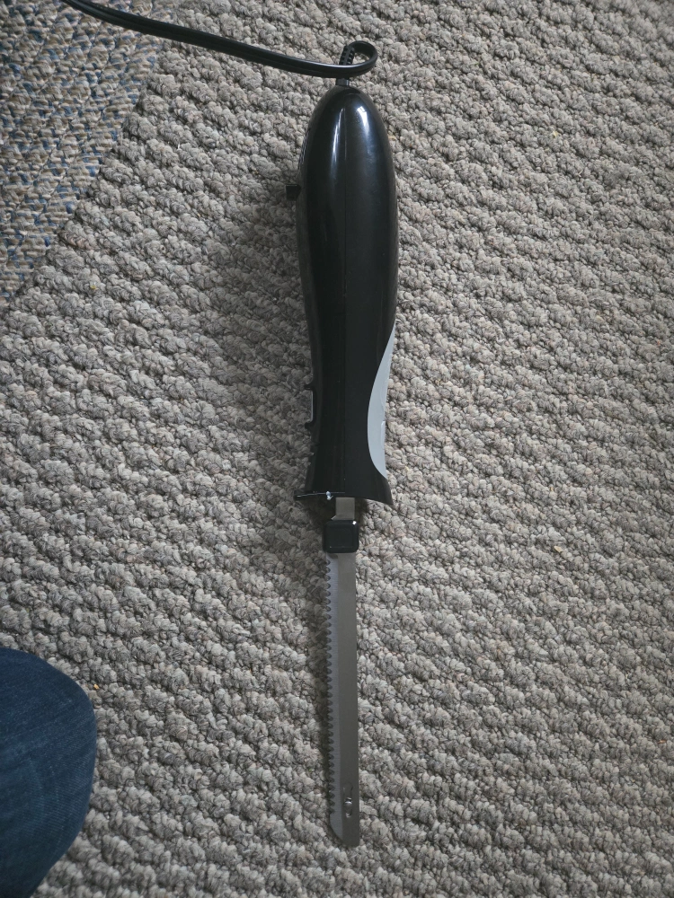 Show allBlack and grey electric knife. Features a blade with serrated edges. Perfect for effortlessly slicing through food for dinner parties, bringing peace of mind. pick up in owen sound.