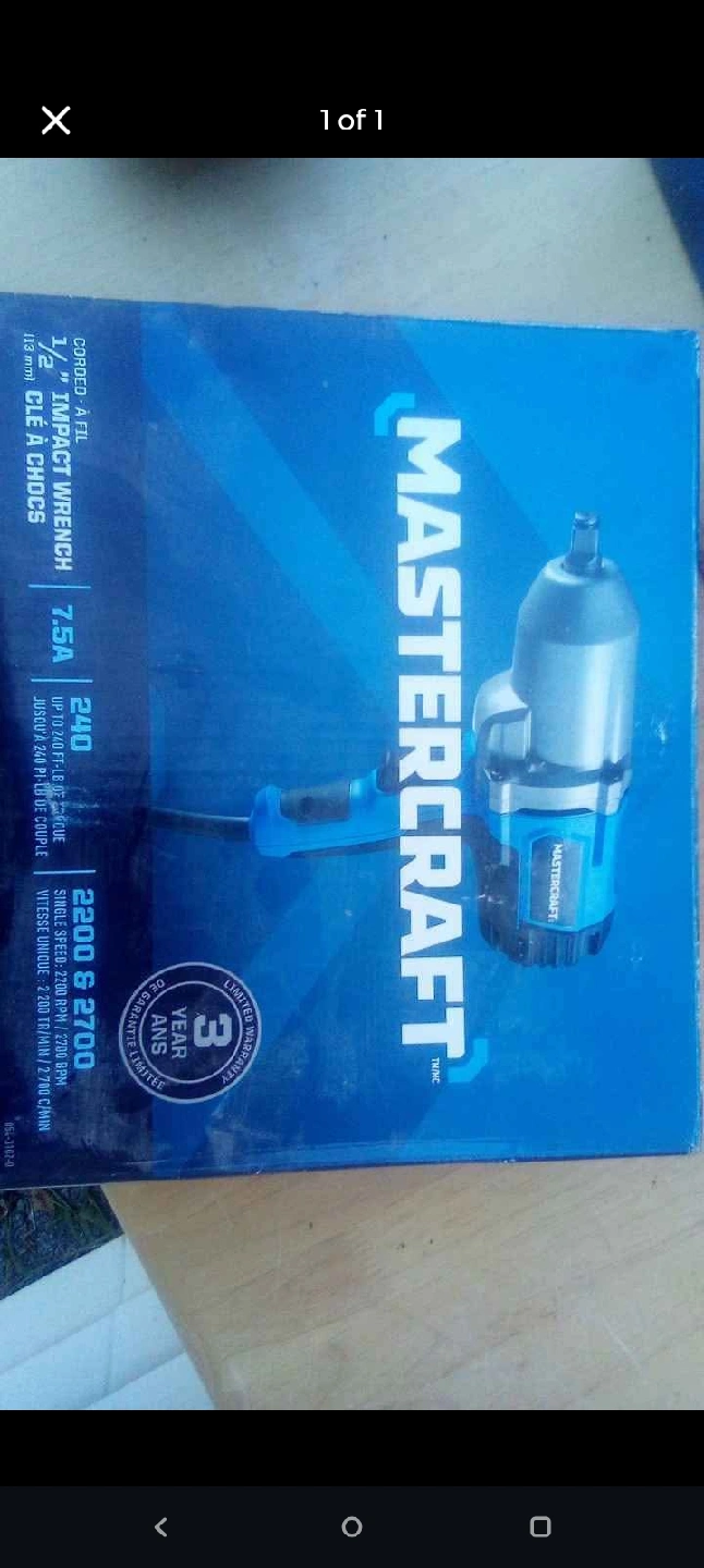 Selling a Mastercraft 1/2" corded impact wrench. It's a 7.5A model with a single speed of 2200 RPM/2700 BPM. It delivers up to 240 ft-lb of torque.