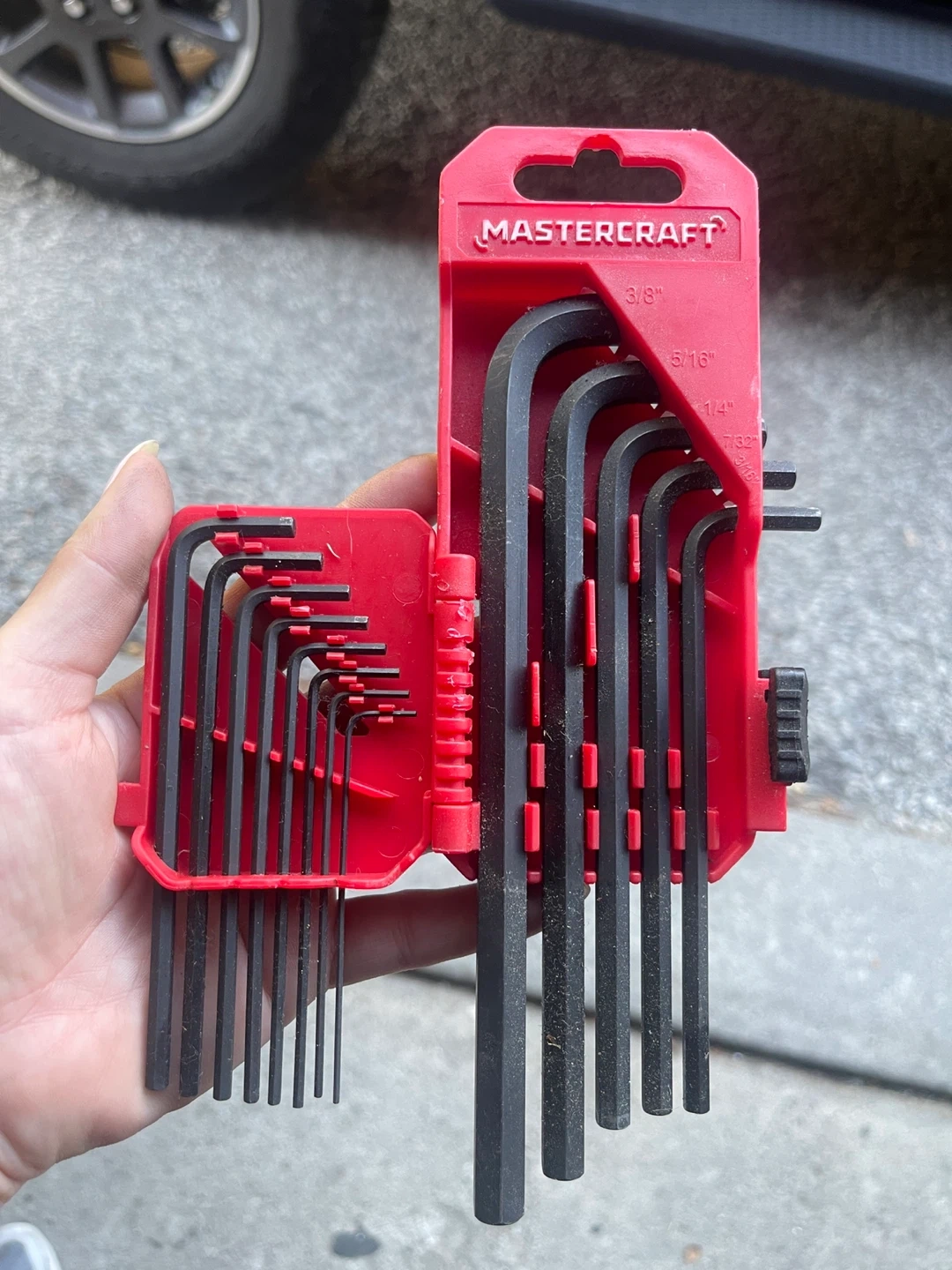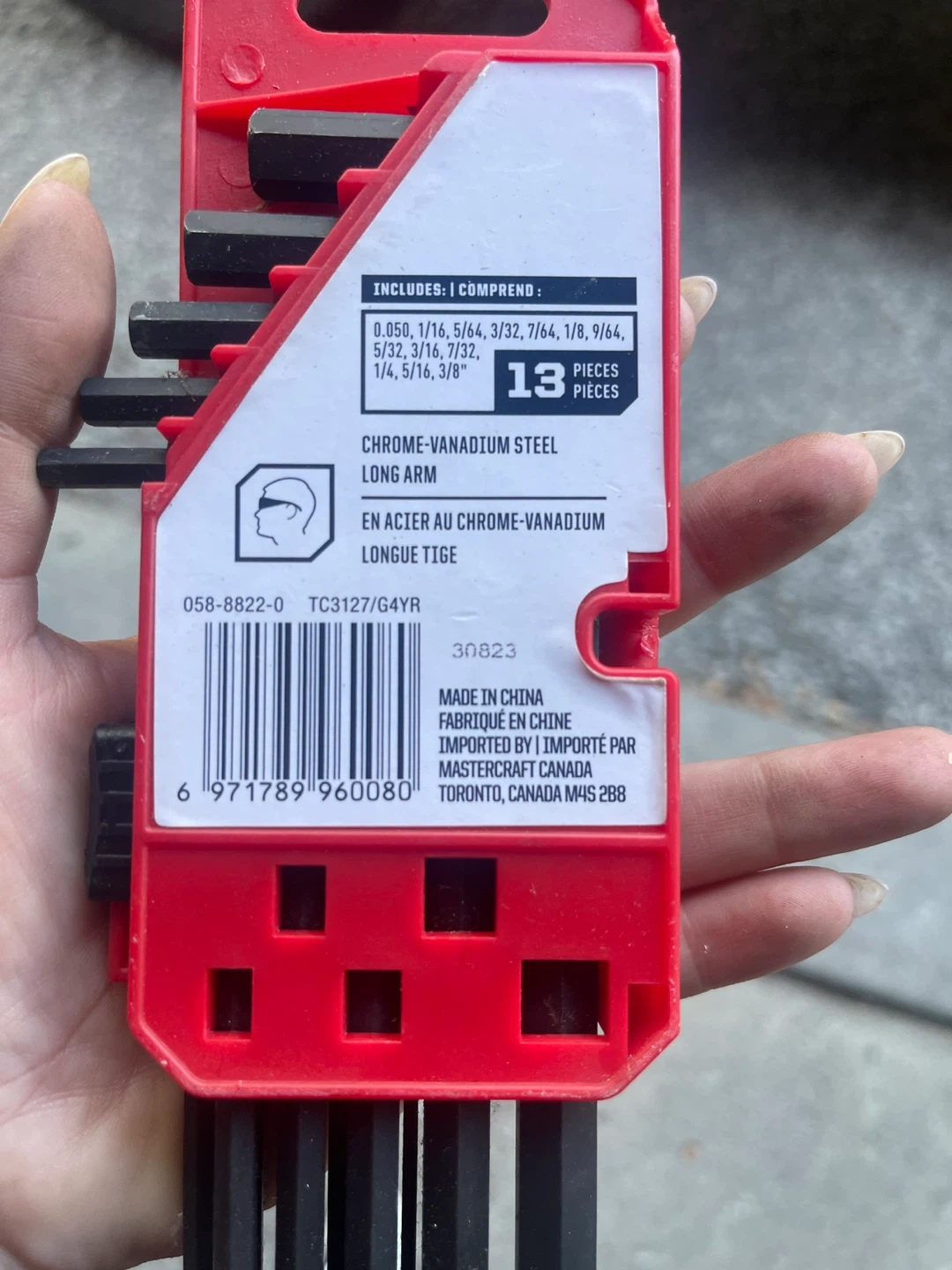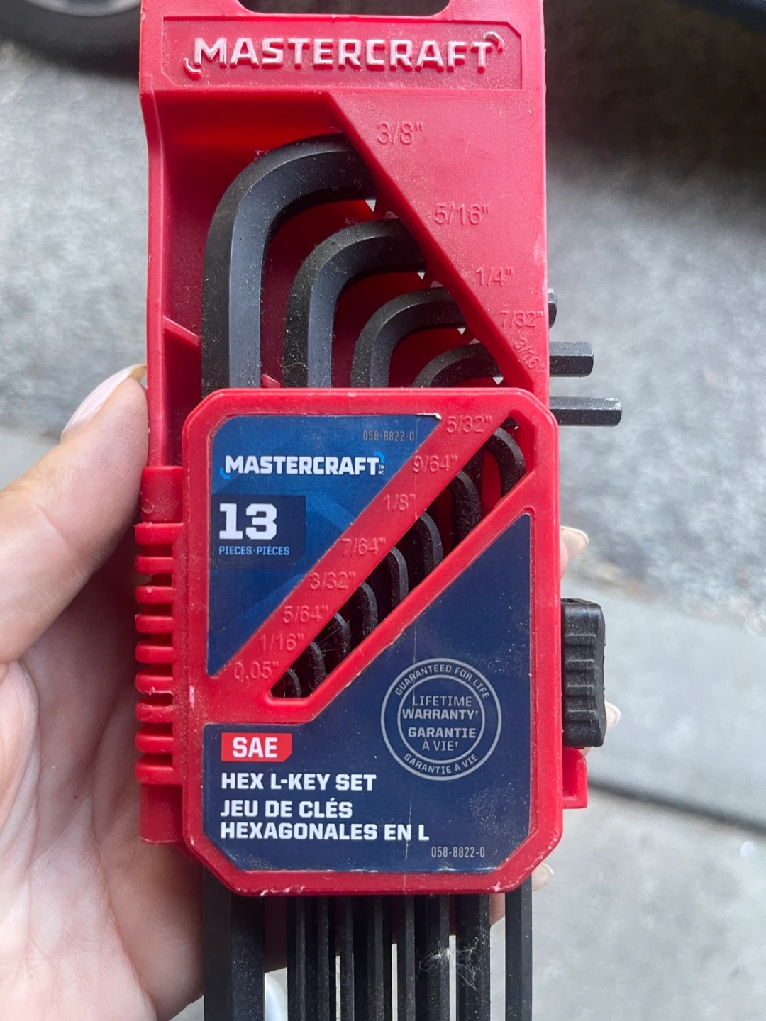 Selling a Mastercraft 13-piece SAE hex L-key set. It's a long arm set made of chrome-vanadium steel. Includes a variety of sizes from 0.050" to 3/8". Comes in a red organizer case for easy storage and selection