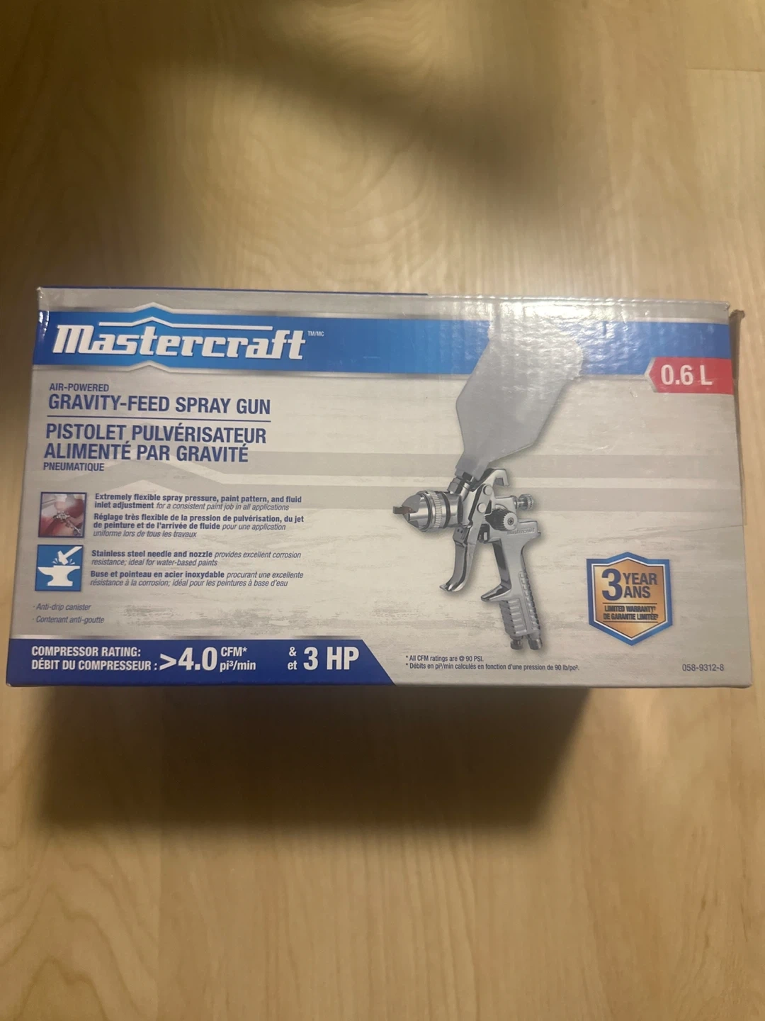 Selling a Mastercraft gravity-feed spray gun with a 0.6L capacity! This air-powered pneumatic tool features an extremely flexible spray pressure, pallet pattern, and fluid inlet adjustment for various tasks. The stainless steel needle and nozzle provide excellent corrosion resistance, making it ideal for water-based paints. It also has an anti-drip canister to keep things clean. The box is included