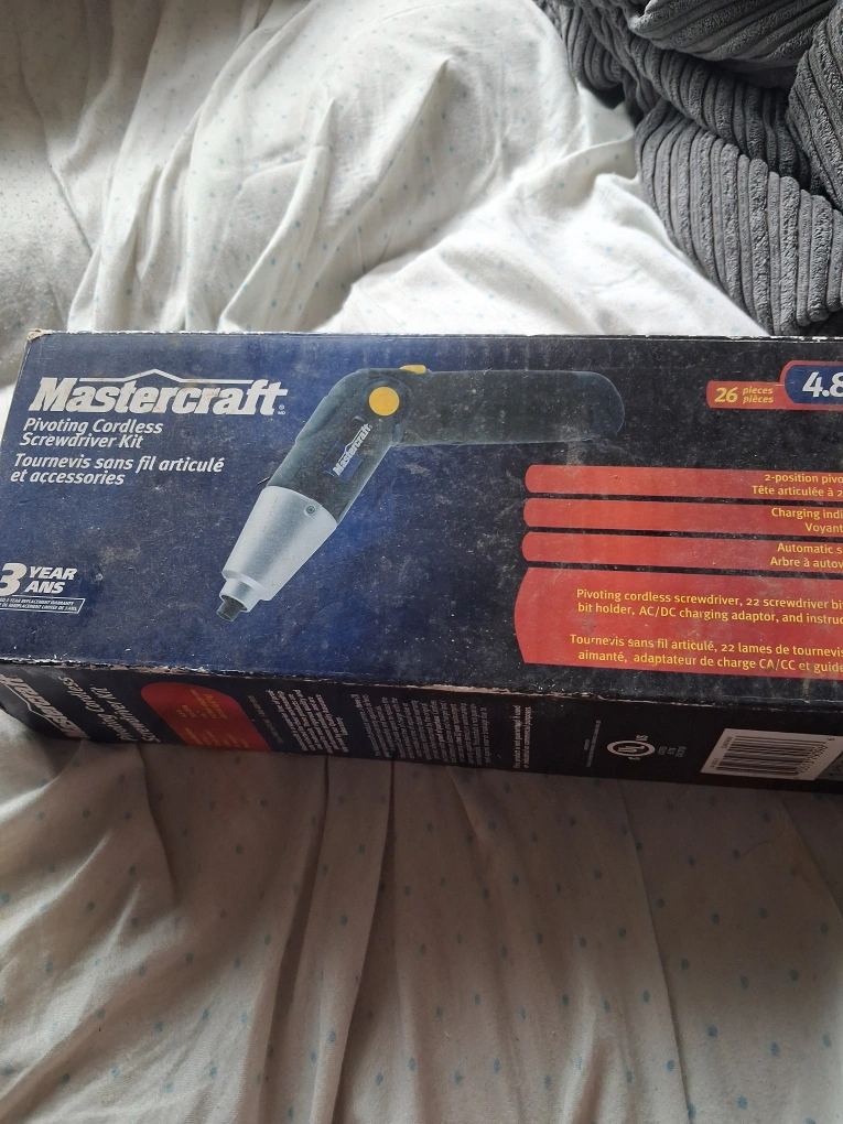 Selling a Mastercraft pivoting cordless screwdriver kit! It includes 26 pieces, 22 screwdriver bits, a bit holder, an AC/DC charging adaptor, and instructions! The box is included as well