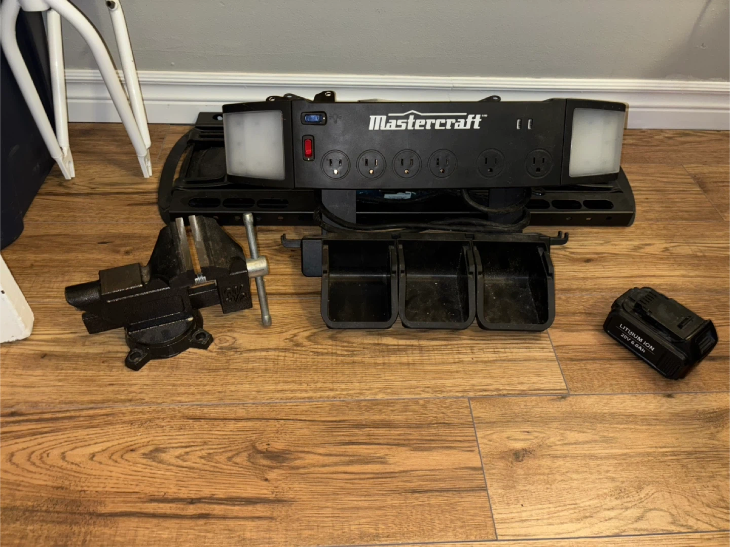Selling a Mastercraft power bar, which includes a vise and a battery. Great for your workshop or garage!