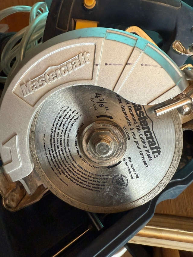 I am selling a Mastercraft wet/dry tile saw with a 4 3/8" diamond tile cutting blade for precise and clean cuts. This saw has been lightly used and is in good working condition. Specifications: * Blade Size: 4 3/8 inches (11 cm) * Blade Type: Diamond Tile Cutting Blade * Suitable for: Ceramic, quarry, and terracotta tiles * Max RPM: 14,000 * Arbor Size: 3/4 inch (1.9 cm) Includes carry case and wet hose It's ready to tackle your tiling projects with ease!