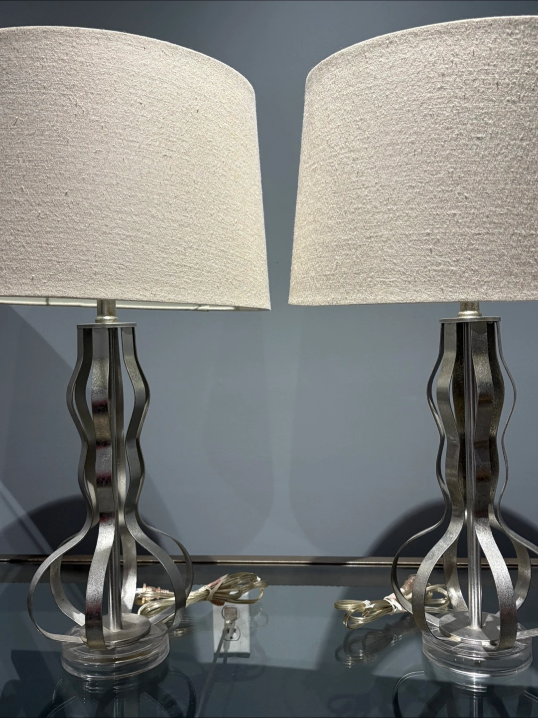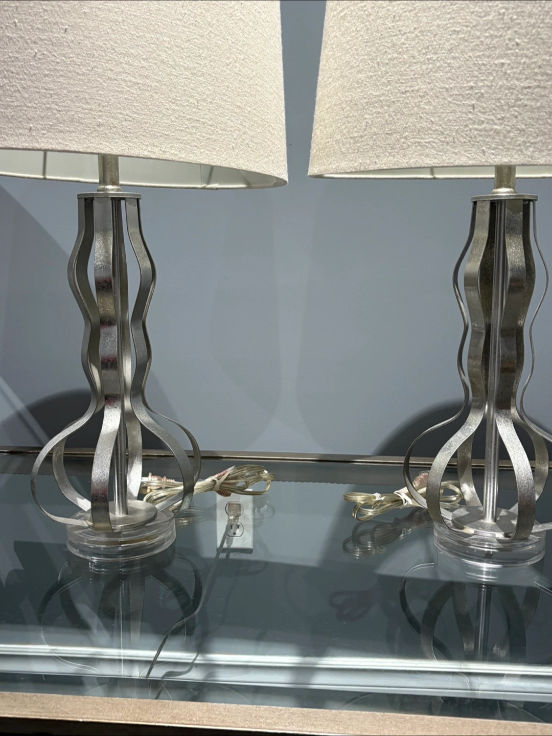 Selling a set of two matching table lamps. They feature a unique, wavy metal base and a neutral-toned lampshade. They would look great on bedside tables or in a living room!