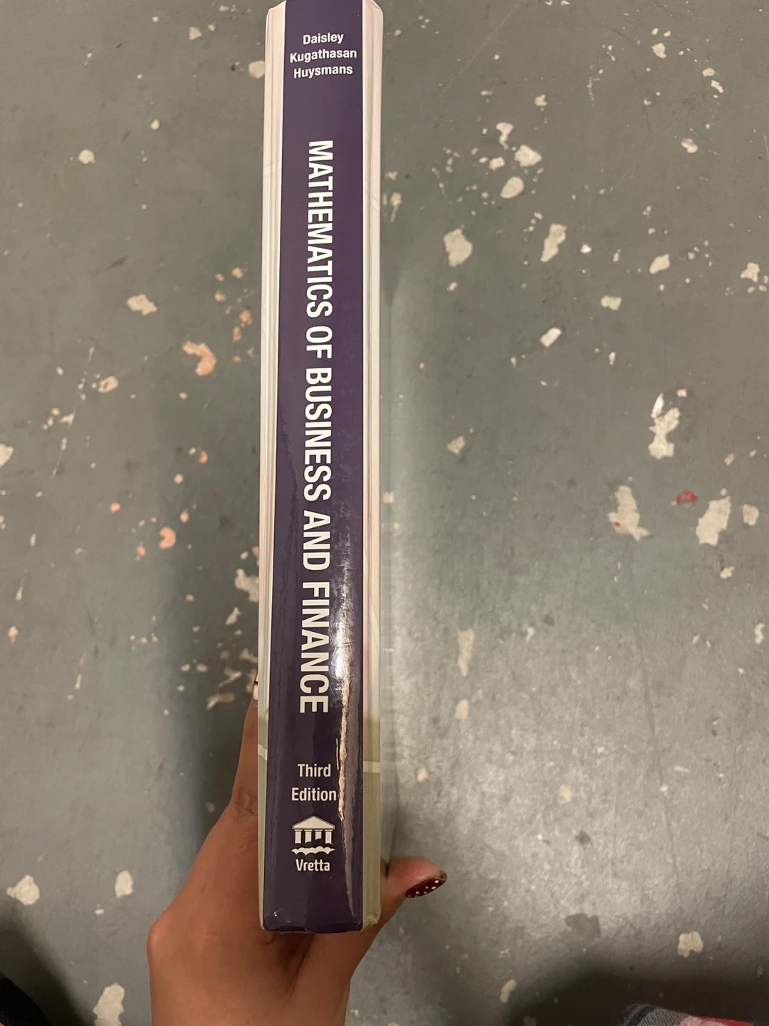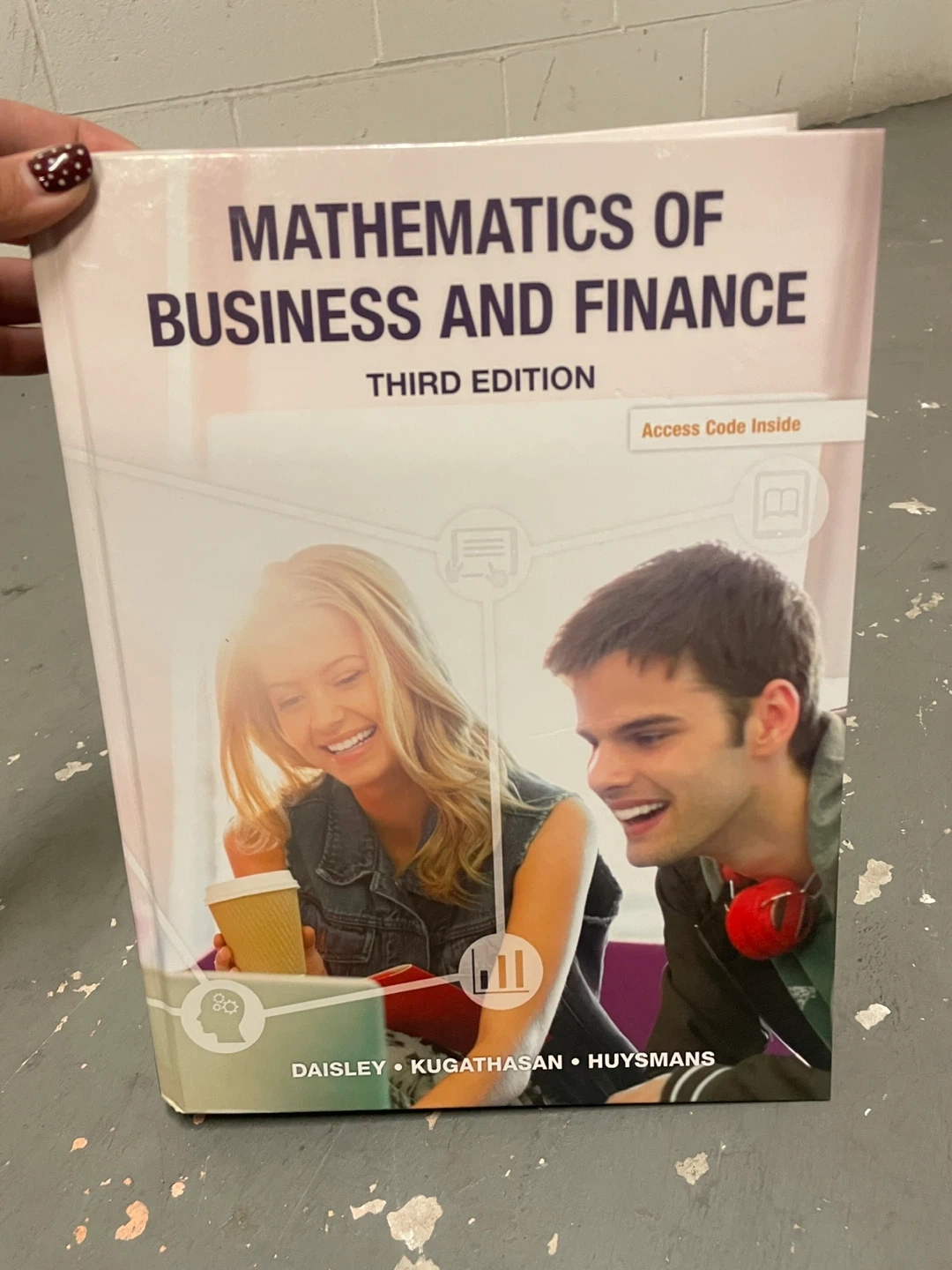 Selling a textbook titled Mathematics of Business and Finance, Third Edition by Dalsley, Kugathasan, and Huysmans. It's in great condition and includes an access code inside.