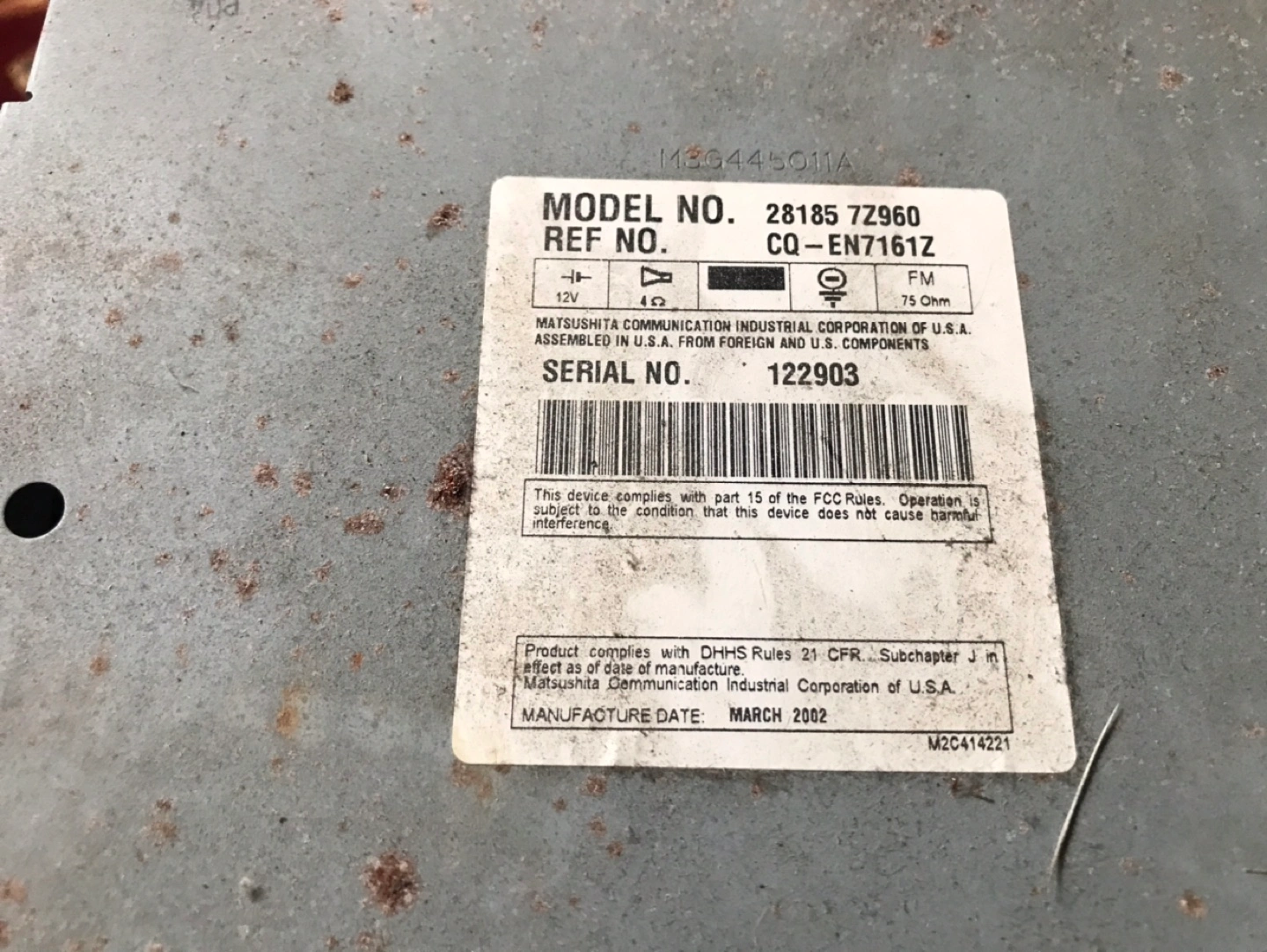 Selling a Matsushita 6-Disc CD Changer. Model number: CQ-EN7161Z REF NO: 28185 7Z960 Manufactured in March 2002