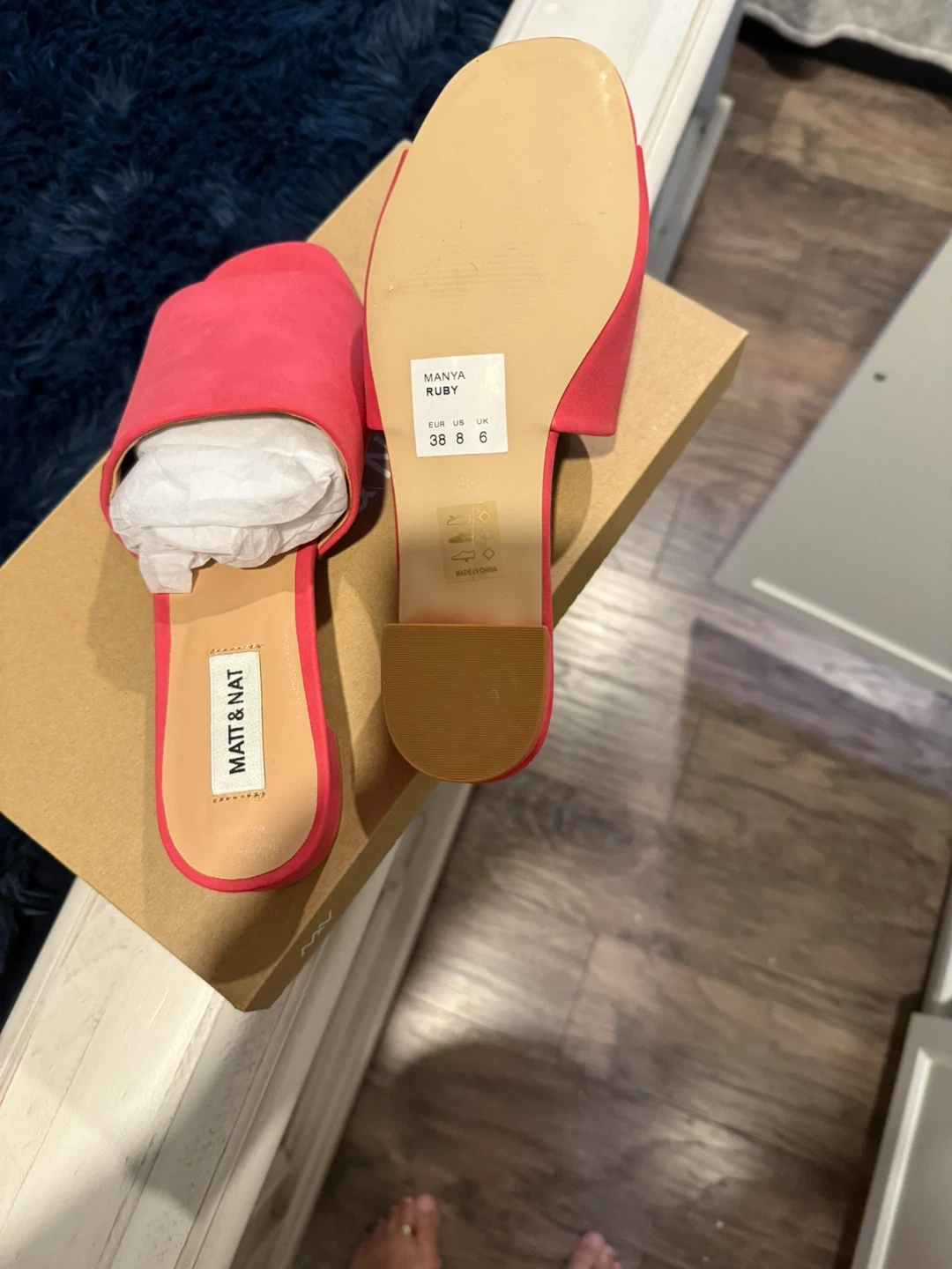 Selling a pair of Matt & Nat Manya slides in pink ! These are a size 8 and come with the original box. Perfect for adding a pop of colour to your outfit!