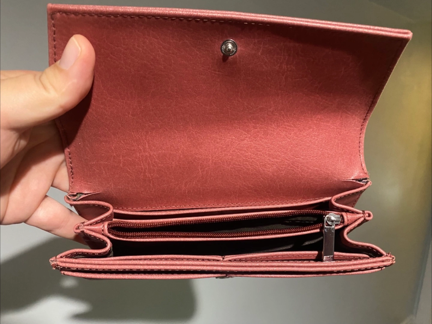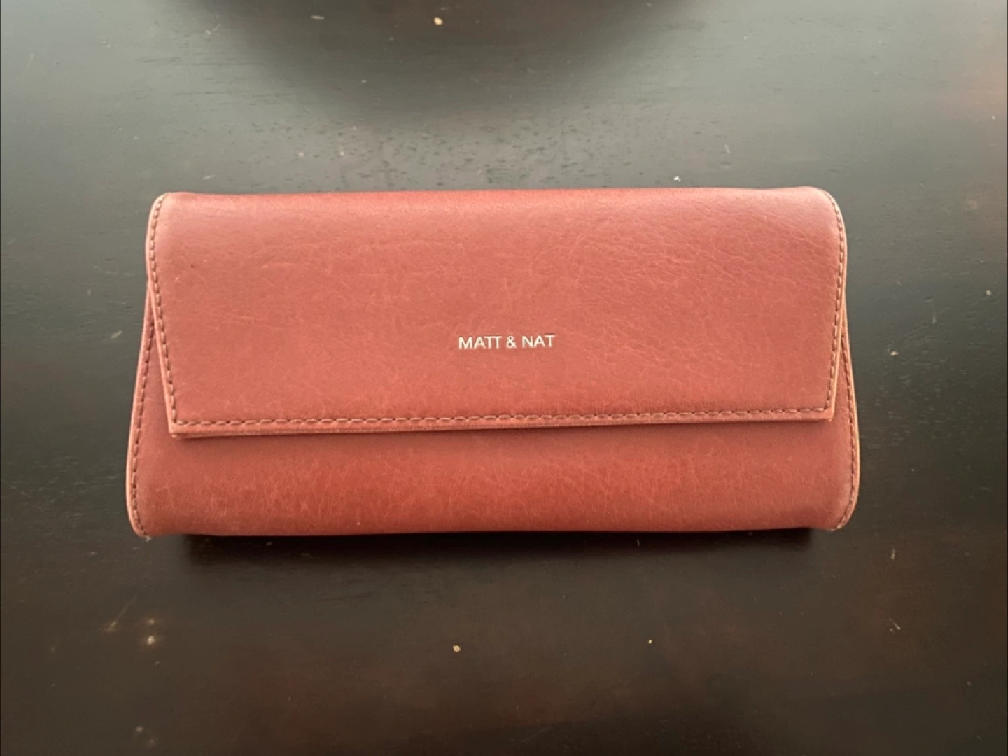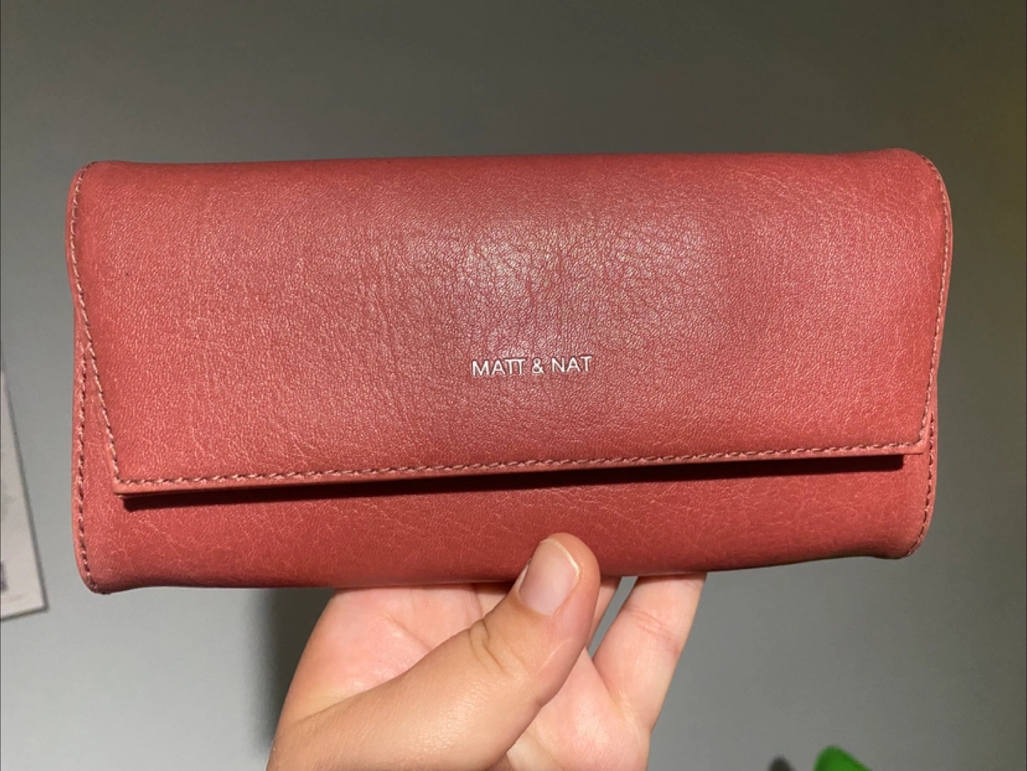 This Matt & Nat rusty rose-coloured wallet combines style and practicality, perfect for keeping your essentials organized. It features multiple card slots, a zippered coin compartment, and a spacious bill section, all in a sleek, compact design. This wallet is in great condition, showing only a minor sign of wear. Features: * Multiple card slots * Zippered coin compartment * Spacious bill section * Snap closure * Vegan leather * Cruelty-free made * Recycled materials Looking to declutter? Well, you're in luck because this wallet is seeking a new home! If you're seeing this ad, the wallet is still available, so don't hesitate to reach out!
