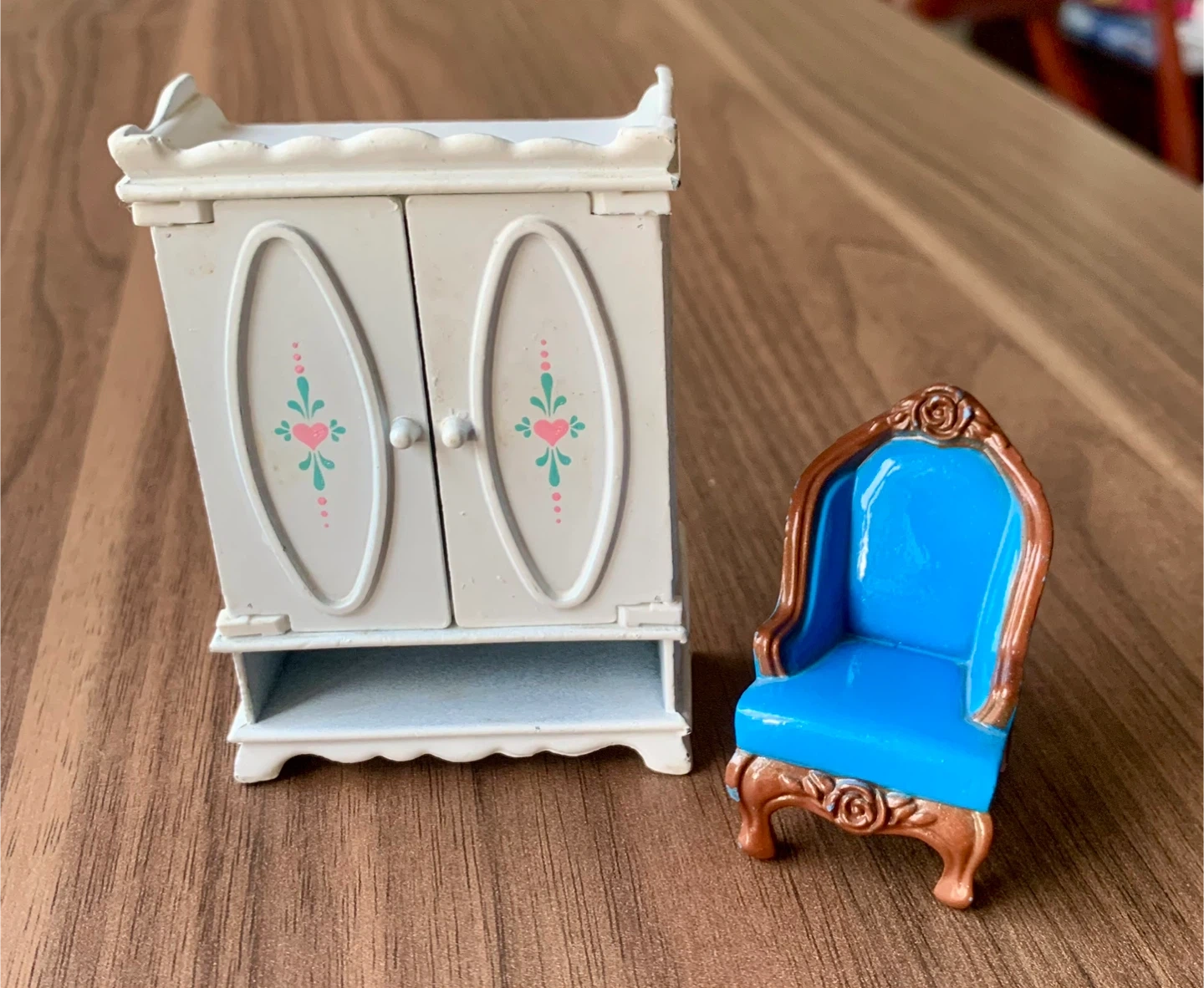 Selling a cute set of vintage Mattel dollhouse furniture from the 1980s! This set includes a white wardrobe with decorative details and a charming blue and brown chair of die cast metal. Perfect for collectors or anyone looking to add a touch of nostalgia to their dollhouse