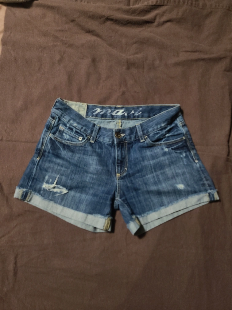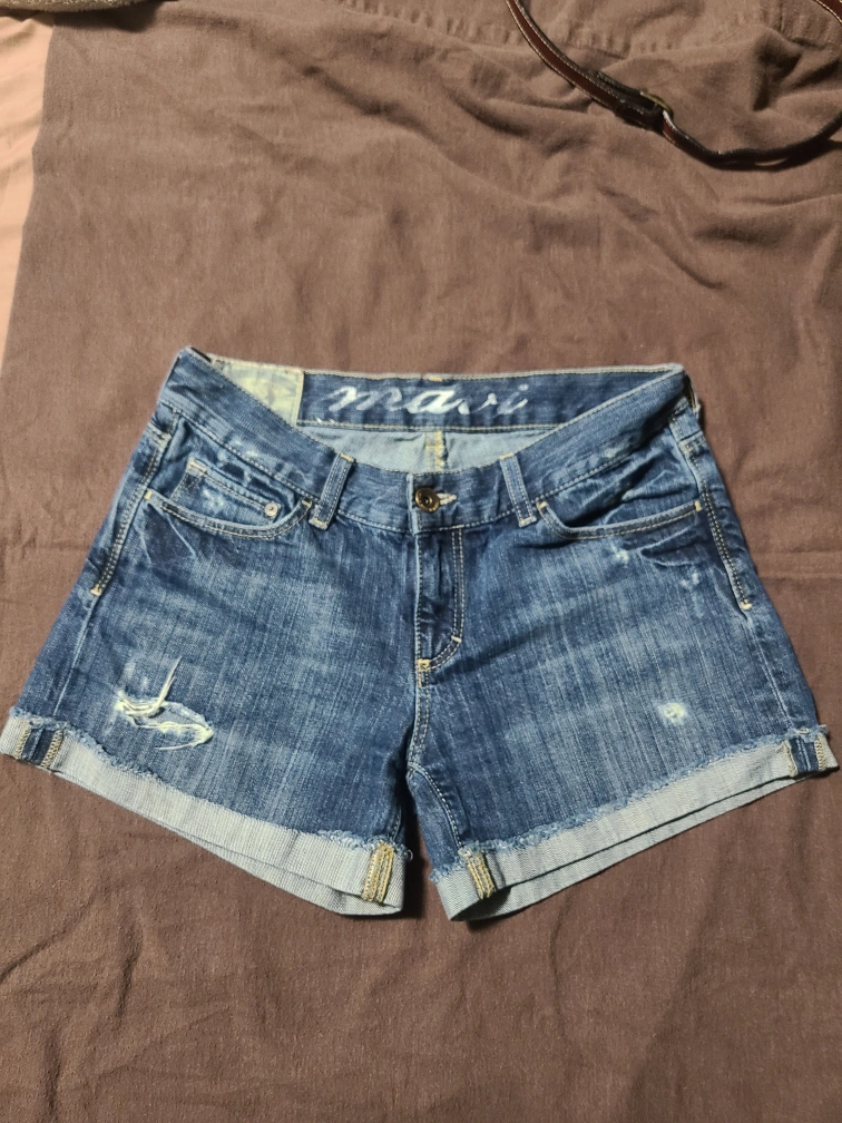 Selling a pair of Mavi denim shorts. They're a size 27 and have a classic denim look. There are some signs of wear, as you can see in the photos, but they're still in good condition for casual wear!