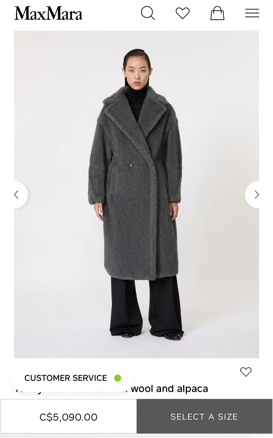 Selling a cozy AUTHENTIC Max Mara Teddy Bear Coat! This stylish coat is made of wool and alpaca, perfect for staying warm in the Canadian weather. It's in great condition and ready for a new home. A screenshot shows the original price at C$5,090.00 Size L Bought last year!