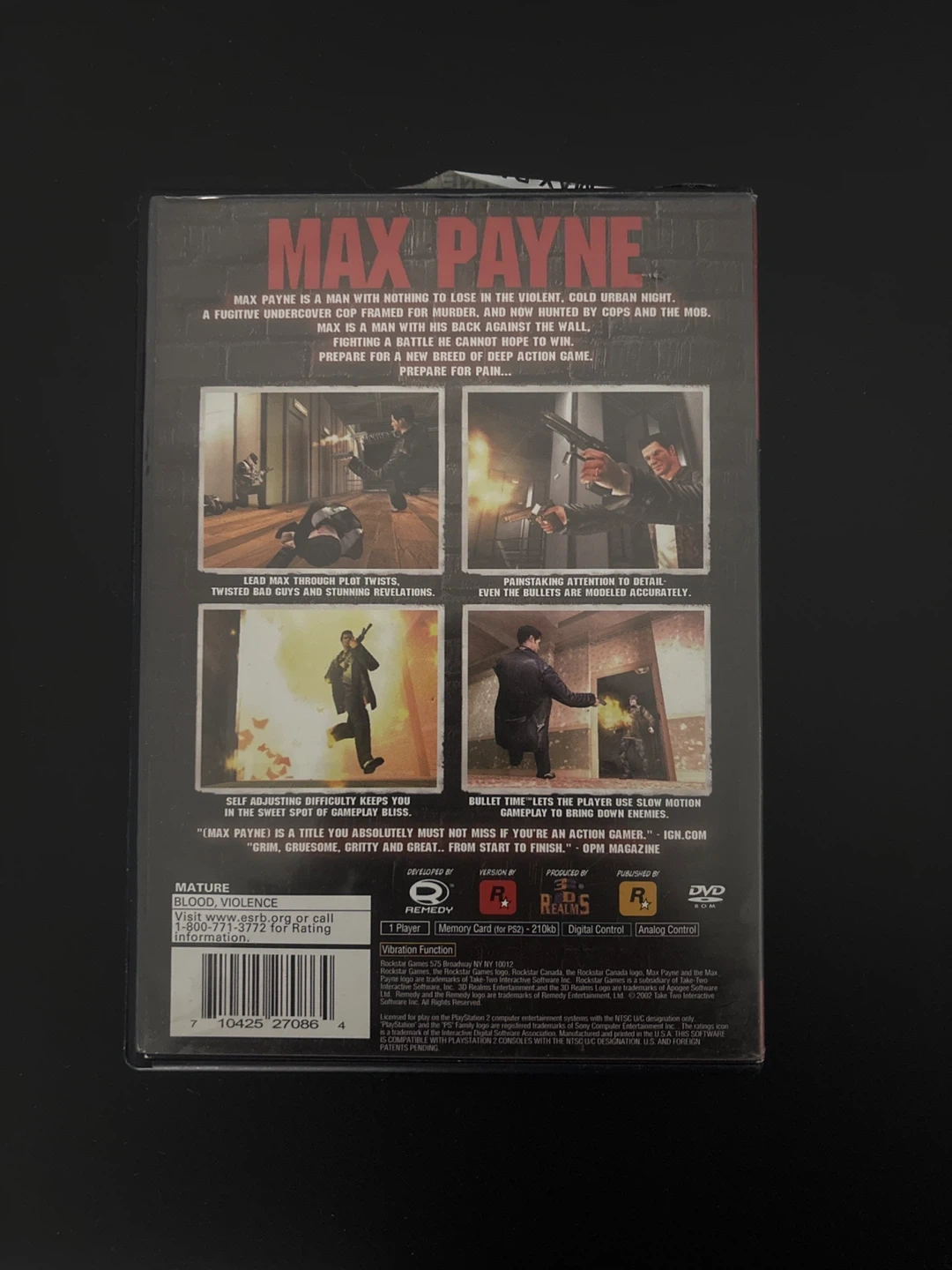 Selling Max Payne for the Playstation 2! This is the Greatest Hits version. Get ready for a deep action game with a gripping storyline. Lead Max through plot twists and experience stunning revelations. Painstaking attention to detail ensures even the bullets are modeled accurately