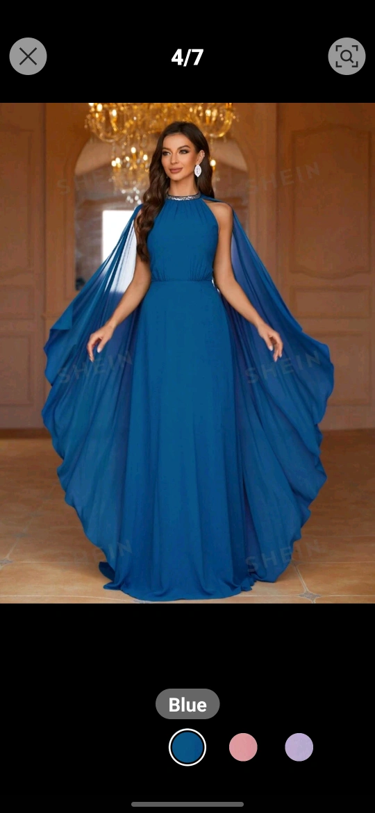 Blue halter neck dress with a cape. The dress is sleeveless and the cape is long and flowy. The dress is perfect for a special occasion. It is in good condition and has been worn only a few times.