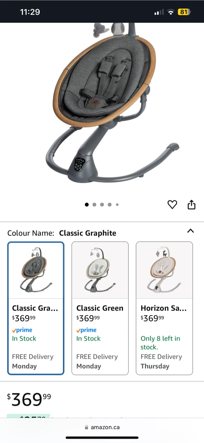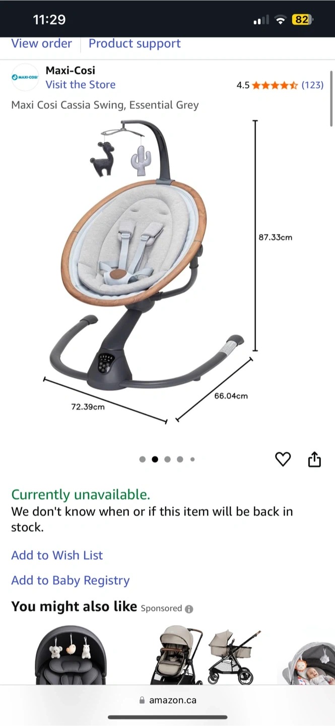 Selling a Maxi-Cosi Cassia Swing in Essential Grey! This comfy swing is perfect for little ones. It has a sleek design and comes in a neutral grey colour that fits any nursery. The dimensions are approximately 87.33cm in height, 72.39cm in width, and 66.04cm in depth. Originally priced at $369.99!