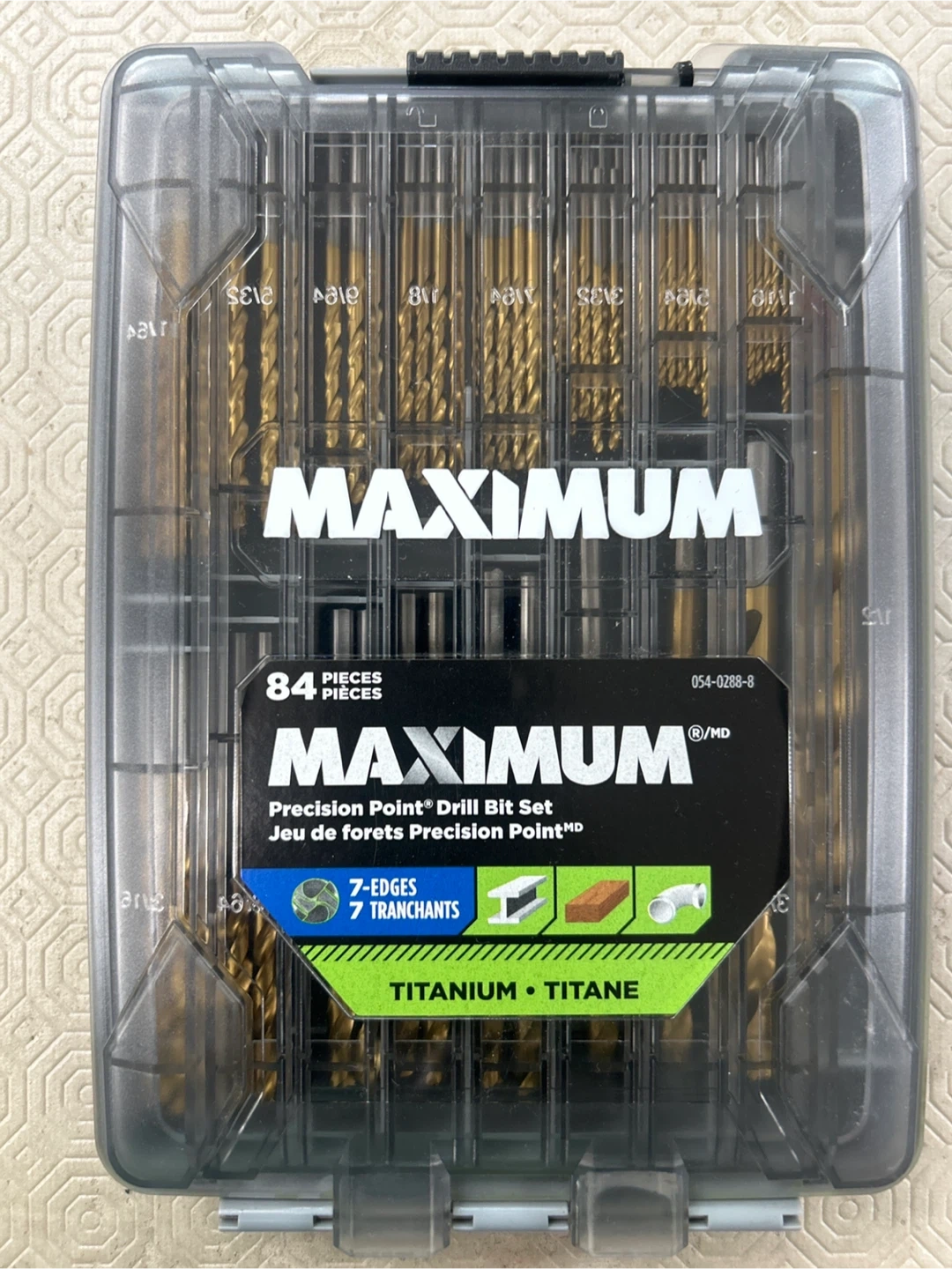 Selling a MAXIMUM 84-piece Precision Point Drill Bit Set. It features 7-edges and has a titanium coating. Great for various drilling tasks!