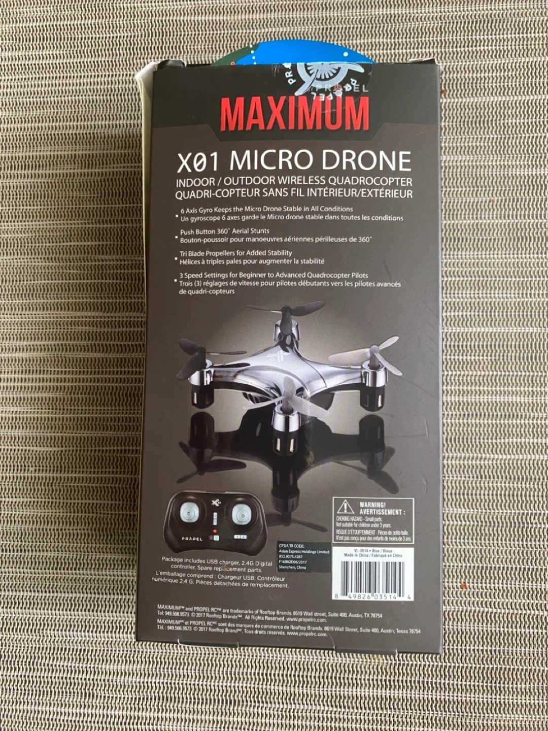 Selling a Maximum X01 Micro Drone! It's an indoor/outdoor wireless quadcopter. It features: - 6 Axis Gyro - Push Button 360° Aerial Stunts - Tri Blade Propellers for Added Stability - 3 Speed Settings for Advanced and Quadcopter Pilots Package includes USB charger, 2.4G Digital Controller, Spare replacement parts, and Instruction booklet Propel Maximum X01 micro Drone wireless $20 obo pick up in Prices Corners cash only. Not a camera