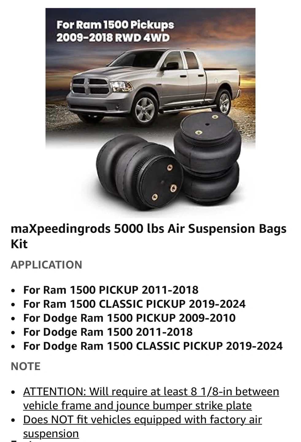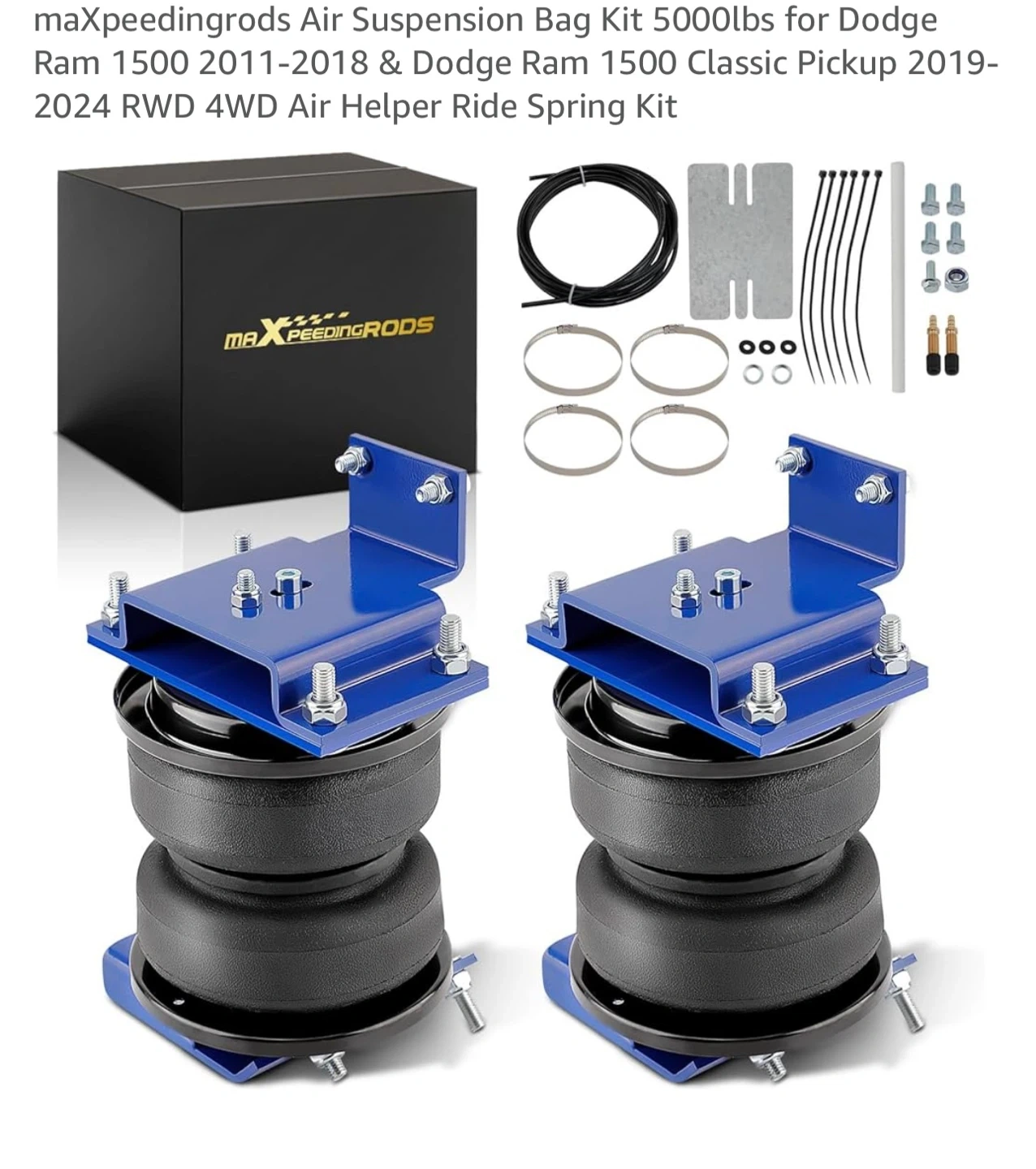 Selling a maXpeedingrods air suspension bag kit, perfect for your Dodge Ram 1500 (2011-2018) or Dodge Ram 1500 Classic Pickup (2019-2024) RWD 4WD. It's designed to provide up to 5000lbs of support. Includes all the necessary hardware for installation, such as air lines, clamps, and fittings. Get ready to upgrade your ride! Just removed from my truck. Had on truck for towing for 5 months. Paid $309 selling $150