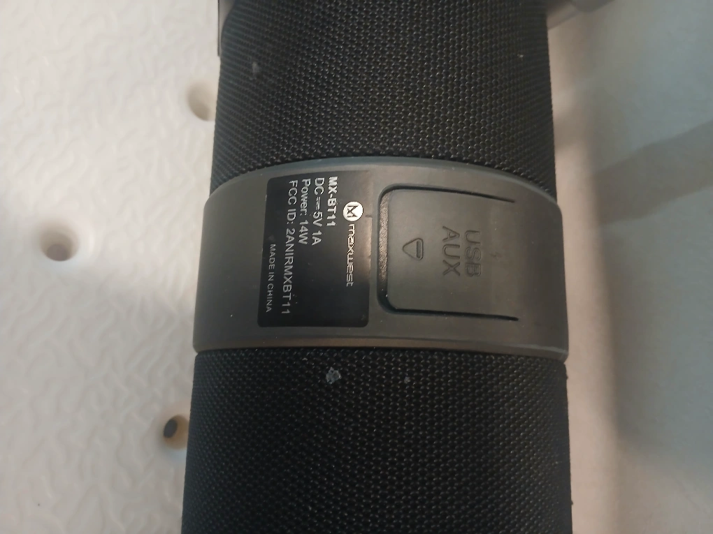 Selling a Maxwest MX-BT11 Bluetooth speaker in good condition! It's a portable speaker, perfect for taking your music on the go. It has USB and AUX inputs for versatile connectivity. Power is DC-5V 1A, and it's made in China works great ...comes wirh charging cord.