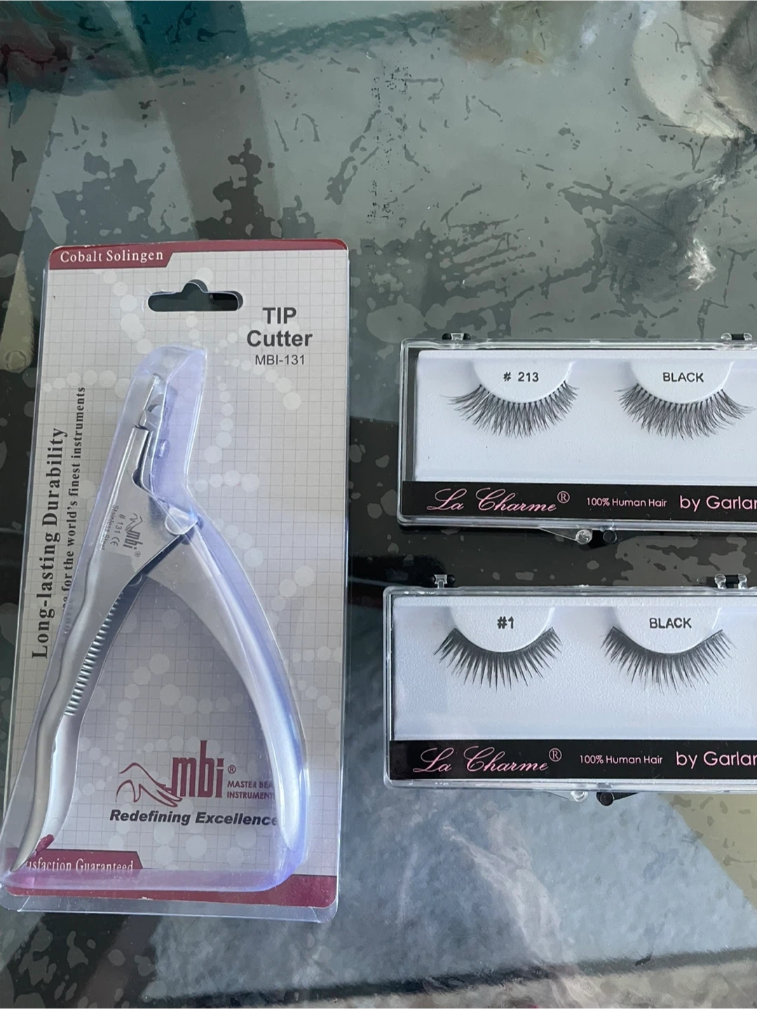 Selling a MBI Tip Cutter MBI-131 for nail care, along with two sets of La Charme false eyelashes. One set is #213 and the other is #1, both in black and made of 100% human hair by Garlar. Perfect for your beauty needs!