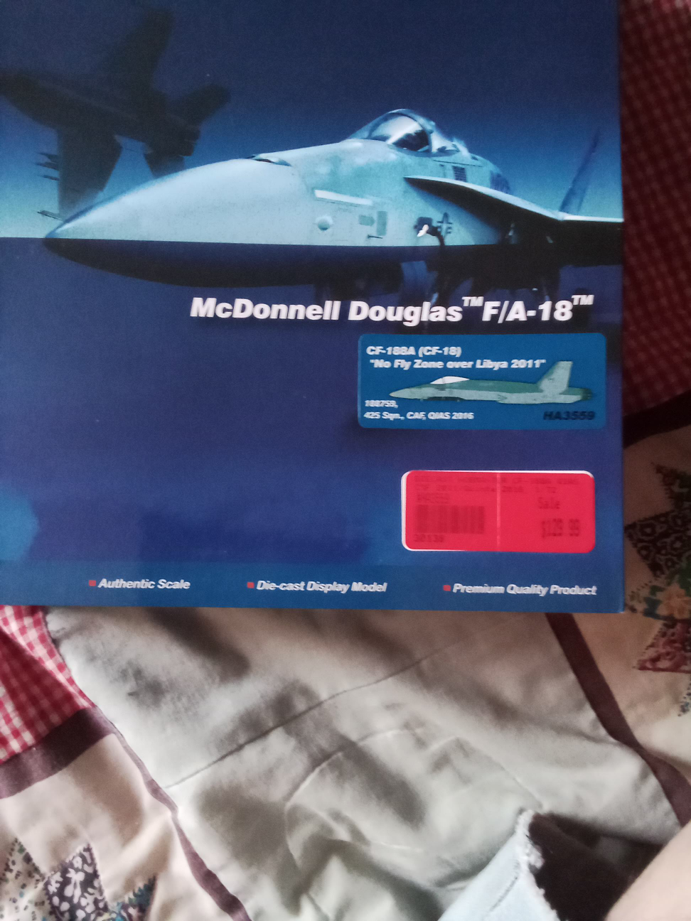Selling a McDonnell Douglas F/A-18 die-cast display model. It's an authentic scale model from Hobby Master, part of the 1:72 Air Power Series. This is a premium quality product and a collector's item, not a toy. The model depicts the CF-188A (CF-18) "No Fly Zone over Libya 2011" from 425 Sqn., CAF, OIAS 2016. Originally bought for $129.99