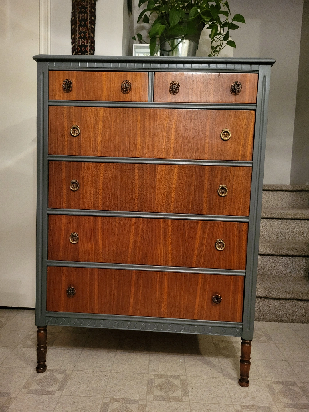 Selling a lovely wooden dresser with six drawers! It features a classic design with a grey trim and unique knobs. Perfect for adding storage and style to any bedroom or living space.It is refinished.
