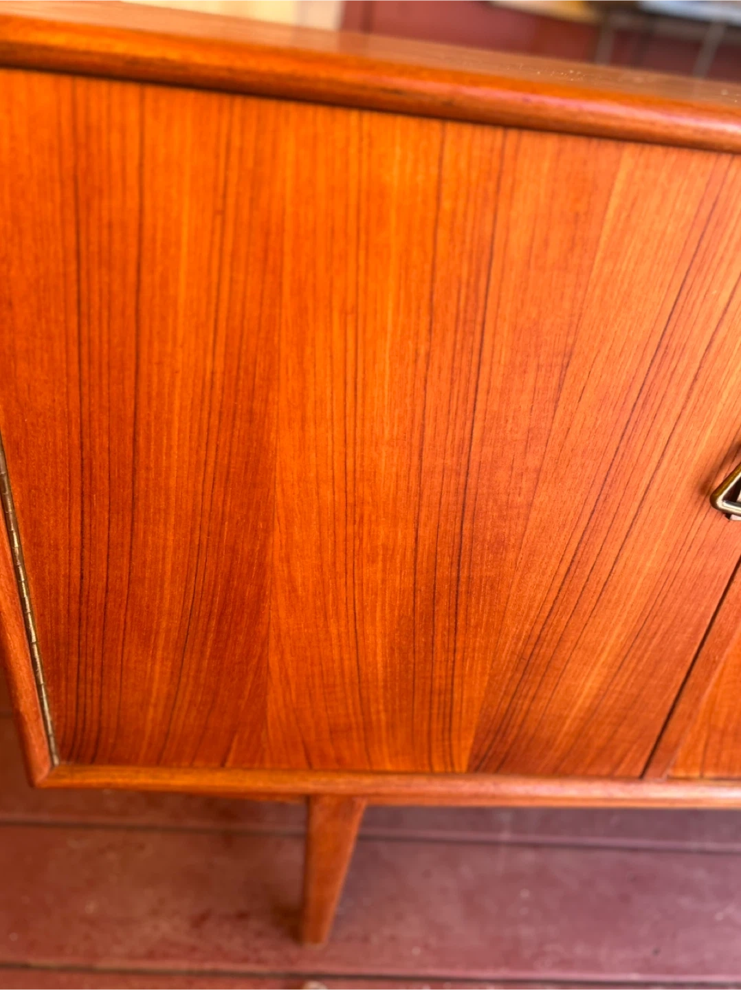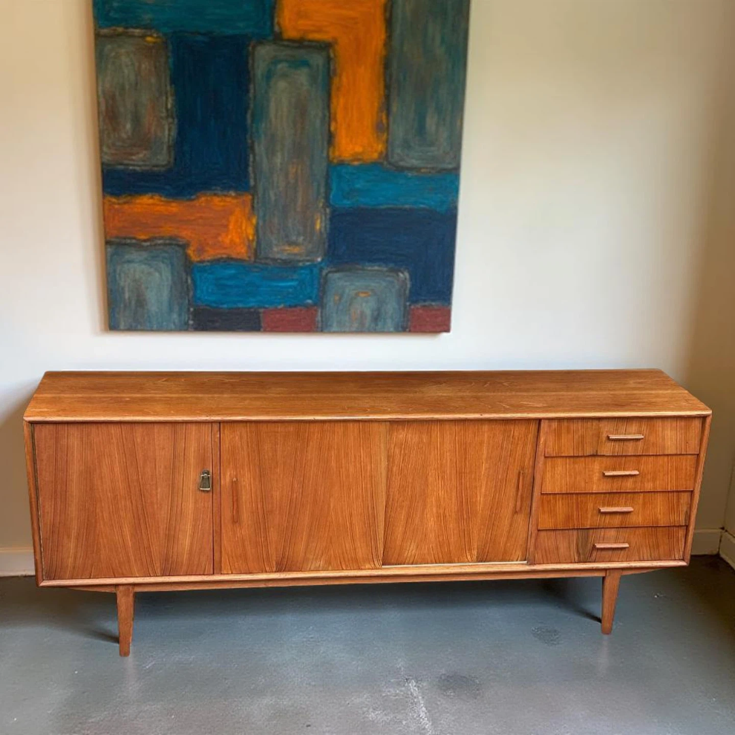Mid-Century Teak Sideboard from Clausen & Son, 1960s - 4 drawers, two sliding doors with adjustible shelf & side cabinet - good condition - drawer fronts have some cosmetic damage see photos - could be sanded and restained - all drawers intact and slide well. H28.5 - L74in - D16 1/4 in. available for pickup near bank and hunt club